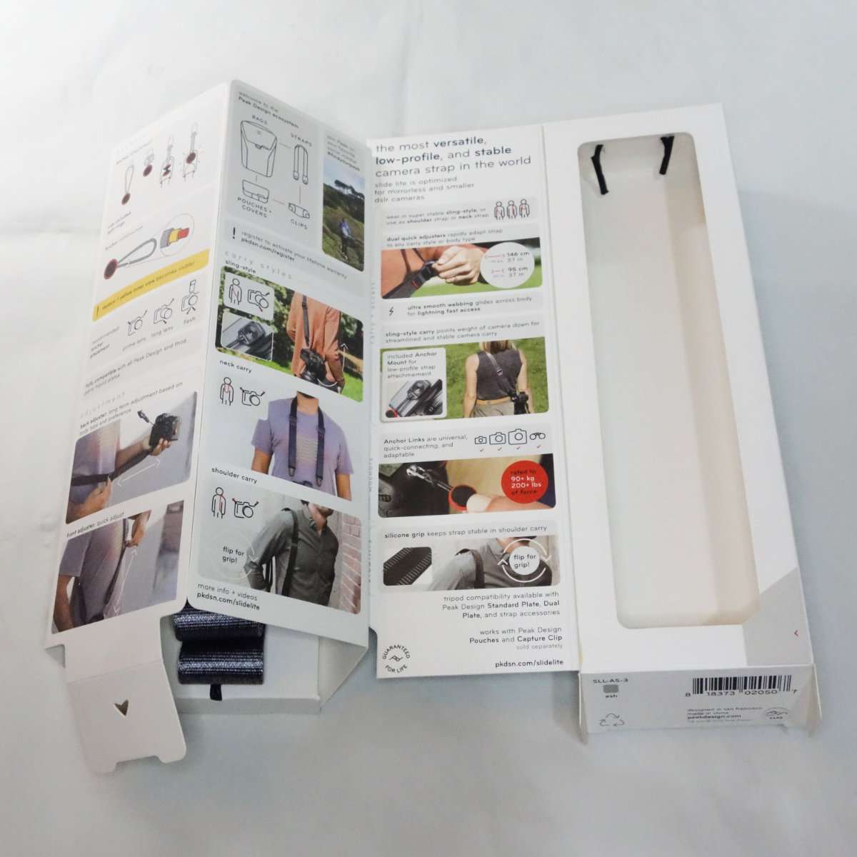 ストラップ本体とカメラとの取付パーツのアンカーリンクスやスライド機能になる調整部など主要な部分が見えるパッケージなので店舗での商品の色味などの確認がしやすくなっています。海外製品なのでこう見えてかなりガッチリと固定されているので、開ける時はゆっくりとワイヤーなどをはずしていきましょう。