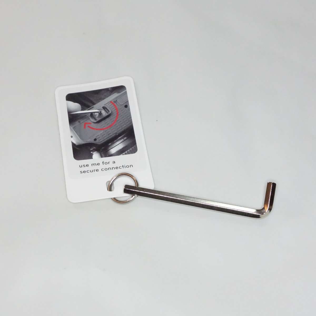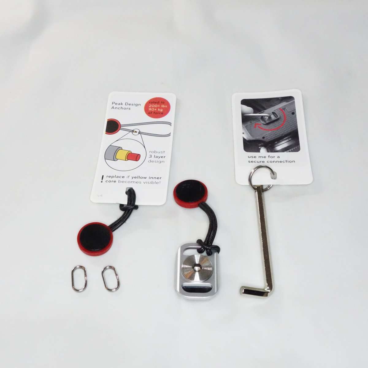 三脚穴にアンカーマウントを取り付けるにはヘックスレンチ(六角レンチ)が必要になりこれはストラップに付属しています。三脚穴への取付はあまり力を入れすぎて回すとリング側が先に曲がる強度で設計しているとは思いますが、カメラ側が壊れてしまうので気をつけましょう。出先で取り外しなどがしたい時に工具がないとどうにもならなくなるので、撮影先でアルカスイスのプレートに入れ替えるなど頻繁にある方はヘックスレンチをカメラバッグに必ず入れておくか、以前のピークデザインのストラップに付属していたアルカスイス対応のアンカーマウントに変更するとよいでしょう。