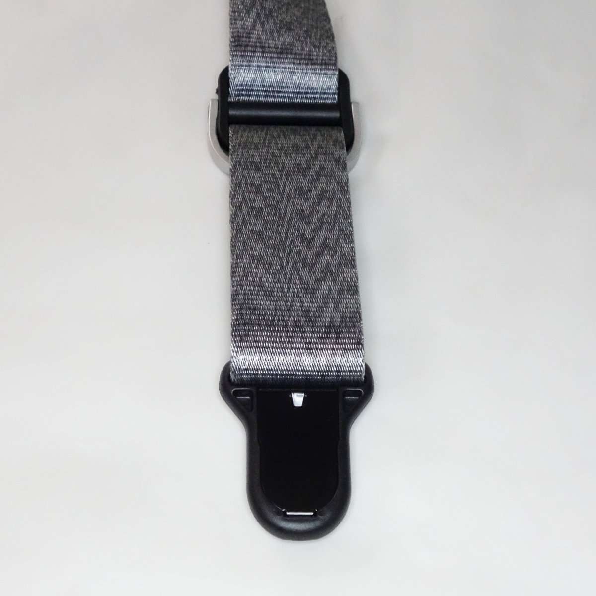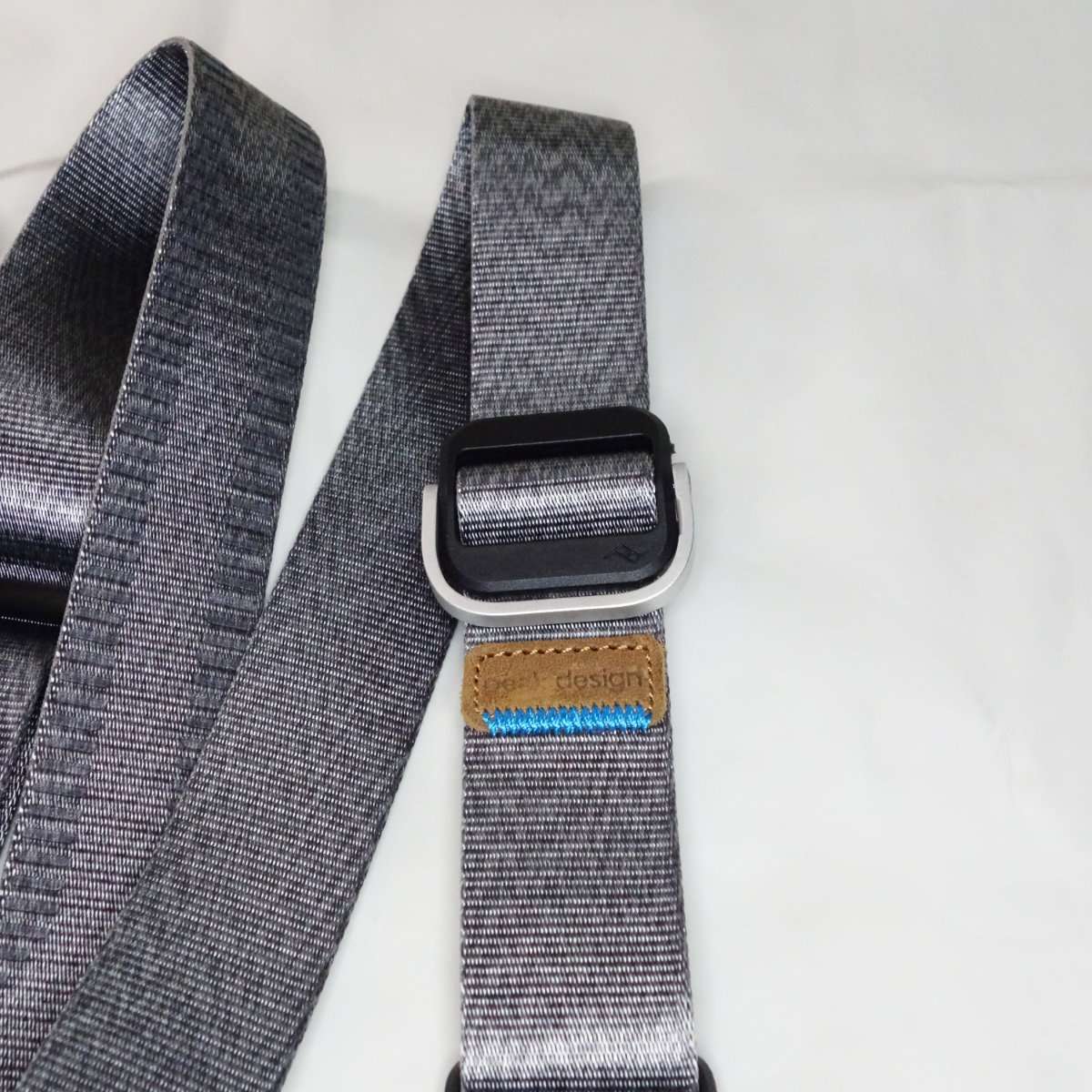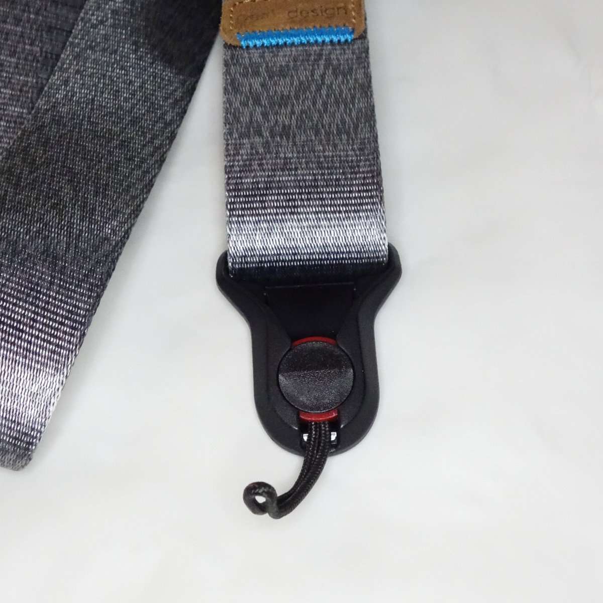 ストラップ本体は生地も全体の作りがよく金具部分のクオリティもとても高いです。ストラップの首と肩にかかる部分は面白いアイデアで通常はスライドさせるために滑る素材の方が下に来ますが、両釣りやストラップを短くした時などにストラップを固定したい場合は裏返すと滑り止め側が下を向くようになっています。