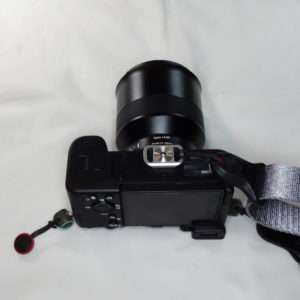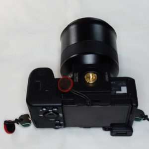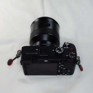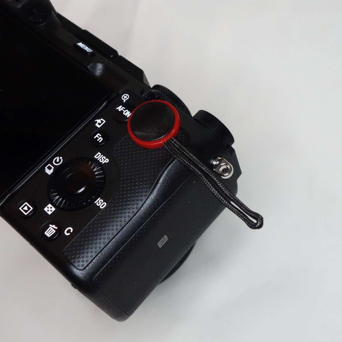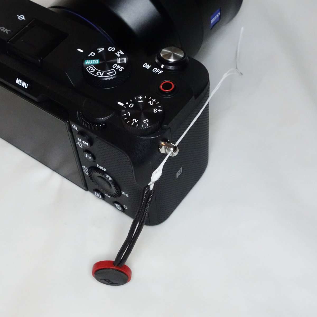 出来上がった即席ストラップリングガードをまずa7Cの左側に取り付けます。ストラップ取り付けのピンにストラップリングガードを取り付けてリング、アンカーの順で取り付けますが、アンカーの紐を通しにく場合は釣り糸などを使用すると楽に紐を通せます。カメラにレンズが付いていますが、ストラップリングを取り付ける場合はレンズを外した状態の方が安全です。