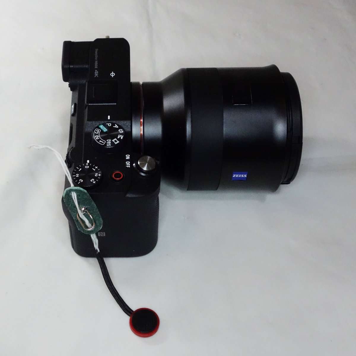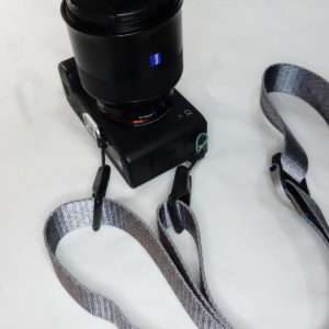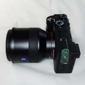 Zeiss Batis 85mmに フィルターと短いメタルフードを取り付けてストラップを縦吊りにして取り回しをよくしました