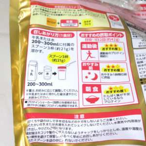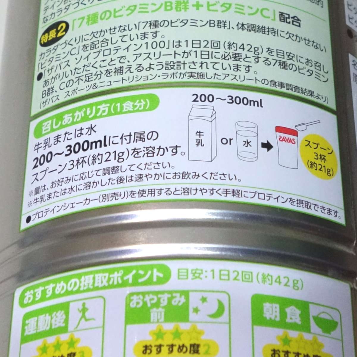 完璧に21gもしくは摂取したいプロテイン量を測るには料理用の測りが0.1g単位で測れて完璧でしょう。ただ、毎回スポーツ後にマイクロメーターを出すのも面倒ですし、何かしら目安になる方法が一番楽でしょう。私はザバスに付属の計量スプーンにきっちりすりきり1杯10gを”2杯”これでほぼ20g前後なり、それをシェーカーに入れ豆乳200mlで割って飲むことにしています。これで毎回30g以上を消費する事もなくなり、200mlの水分で十分によく混ざります。200mlで十分に溶けるようになるので牛乳や豆乳で割っている方はそのコスト削減にもなります。