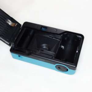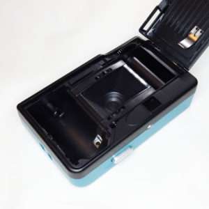 フィルムケースの右側にあるレバーを下げるとフィルムケースが開きますが、間違って開かないように少し開けづらくしてあります。フィルムを入れないとシャッターは切れない