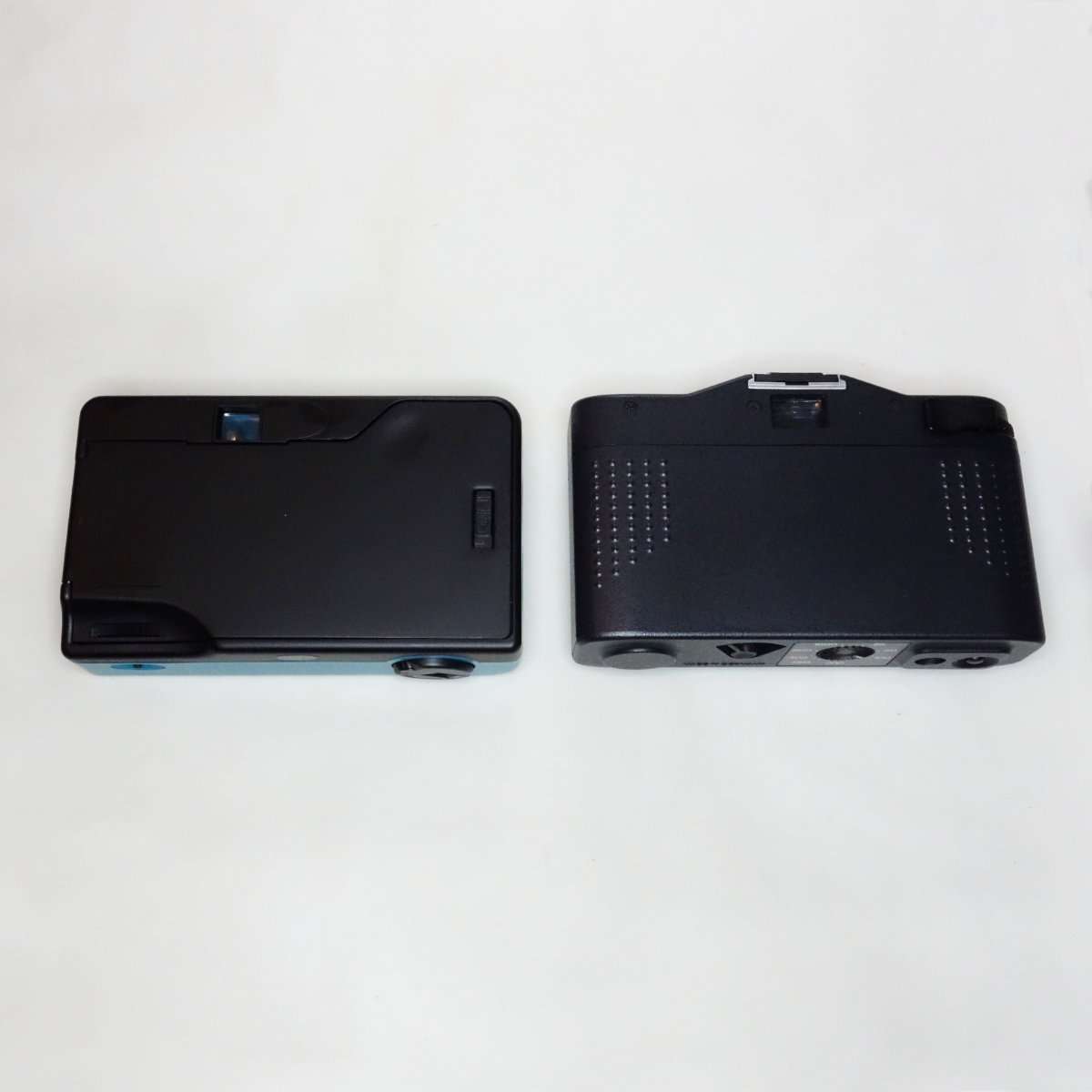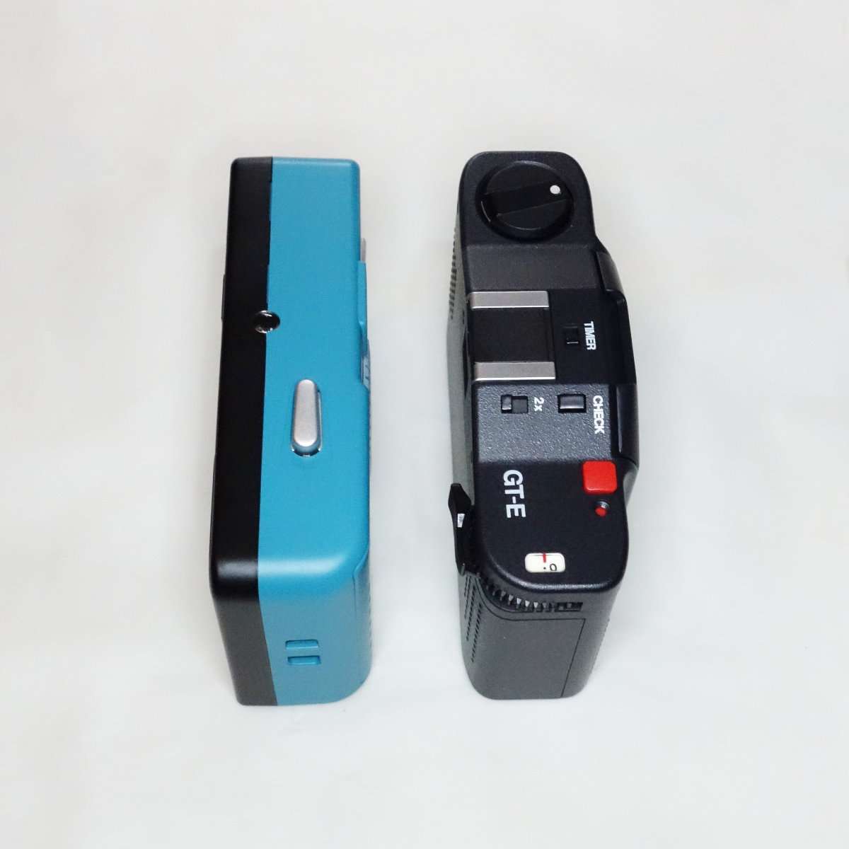 コンパクトフィルムカメラの中でも露出計と絞り搭載では最小ではないかと思われるMINOX 35 GT-Eと比べてみます。サイズはほぼ同じでMINOXの方が若干厚みがあります。これを考えるとMINOXは恐ろしいほど小型化していると言う事がわかります。(MINOX 35の使用時はレンズカバーを開けてレンズを引き出します)