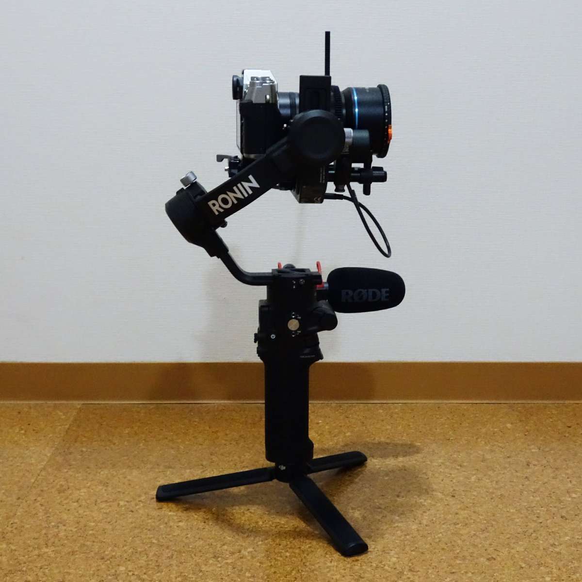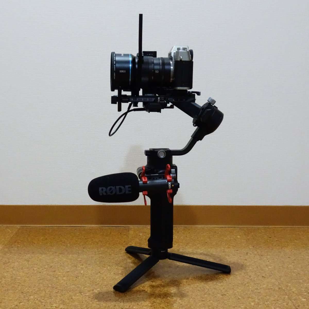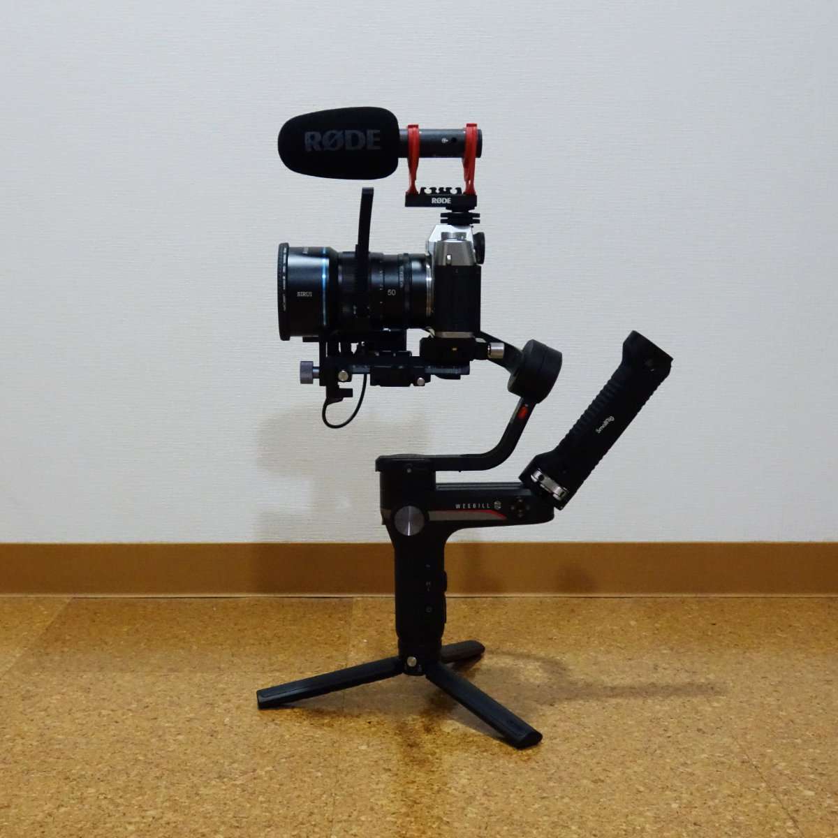 Zhiyun Weebill SにRODEのマイクを取り付けた状態のカメラを載せてみました。ジンバルの設定にはカメラのレンズを上に向ける必要gああるのですが、その時にマイクがジンバルに触れてしまうので、設定方法かマイクの取り付け方に工夫が必要になります。