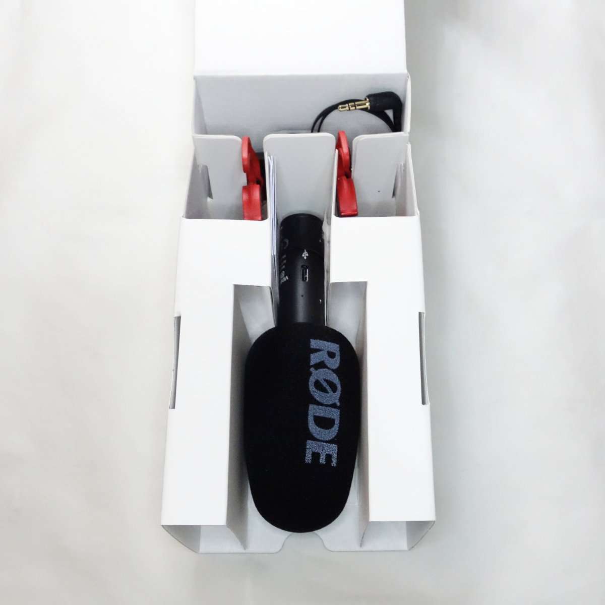 内容はシンプルでマイク本体(ウインドシールド付き)、ショックマウント、接続ケーブルのみです。付属品の型番はSC14(3.5mmTRS – 3.5mmTRSケーブル)、SM8-R(ショックマウント)となっています。ウインドシールドはマイク本体に取り付けられている状態で、ウインドジャマー(ウインドマフ)は付属していません。