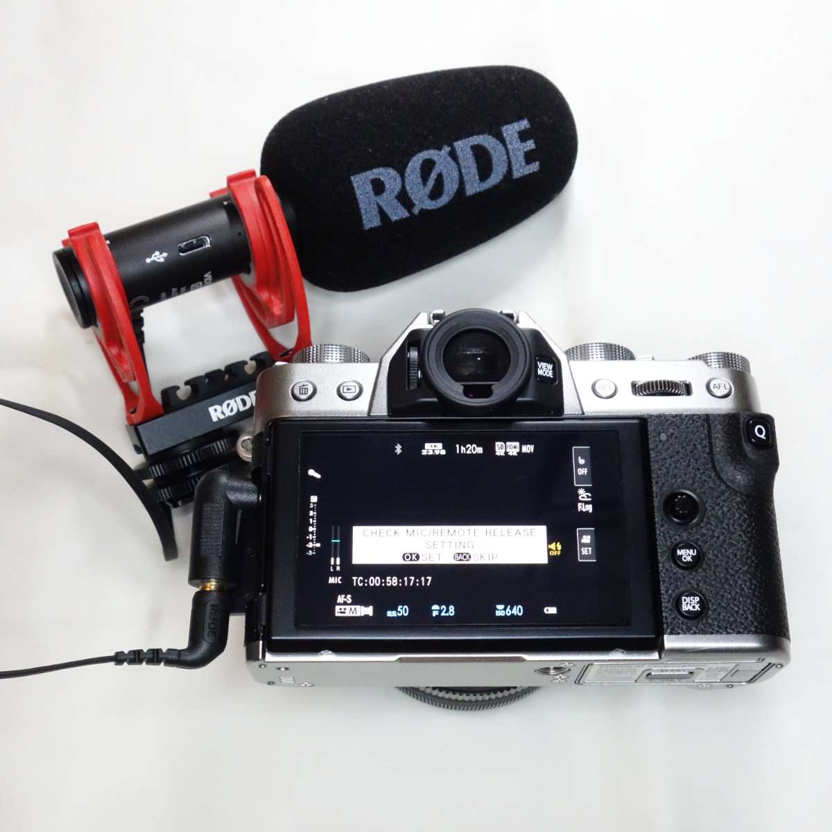 フジフィルムX-T30 IIにマイクを取り付けるとマイクケーブルでレリーズ(カメラコントロールの設定)するか聞かれるので設定をします。この表示が一瞬なので消えてしまったら別途設定するようにしましょう。