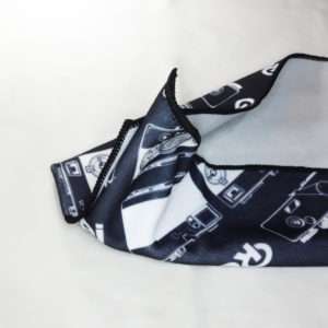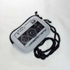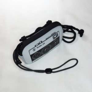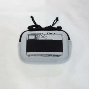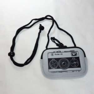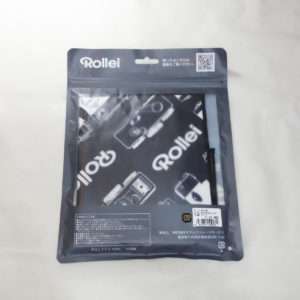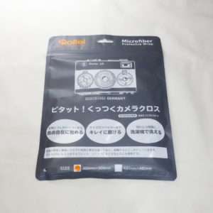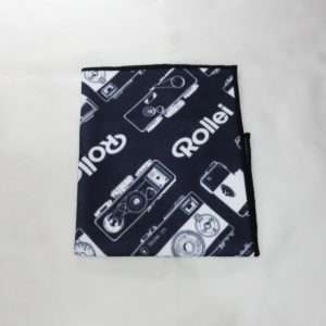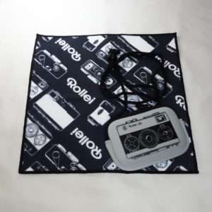 まず最初にローライ35がプリントされたコンパクトカメラ用ポーチのグレー(RL-015-LG)とカメララップのサイズ30cm x 30cm(RL-012M-BK)です。Rolleiflex柄のグッズもありますが、使用されたのが露出計内蔵のモデルでセレン部分がイラストになっていたためローライ35の方を選びました。ポーチは首からかけられるシンプルなもので、カメララップはピタット!くっつくカメラクロスの表記通りに紐やゴムがなくてもラップクロス同士がくっつく面白い作りです。