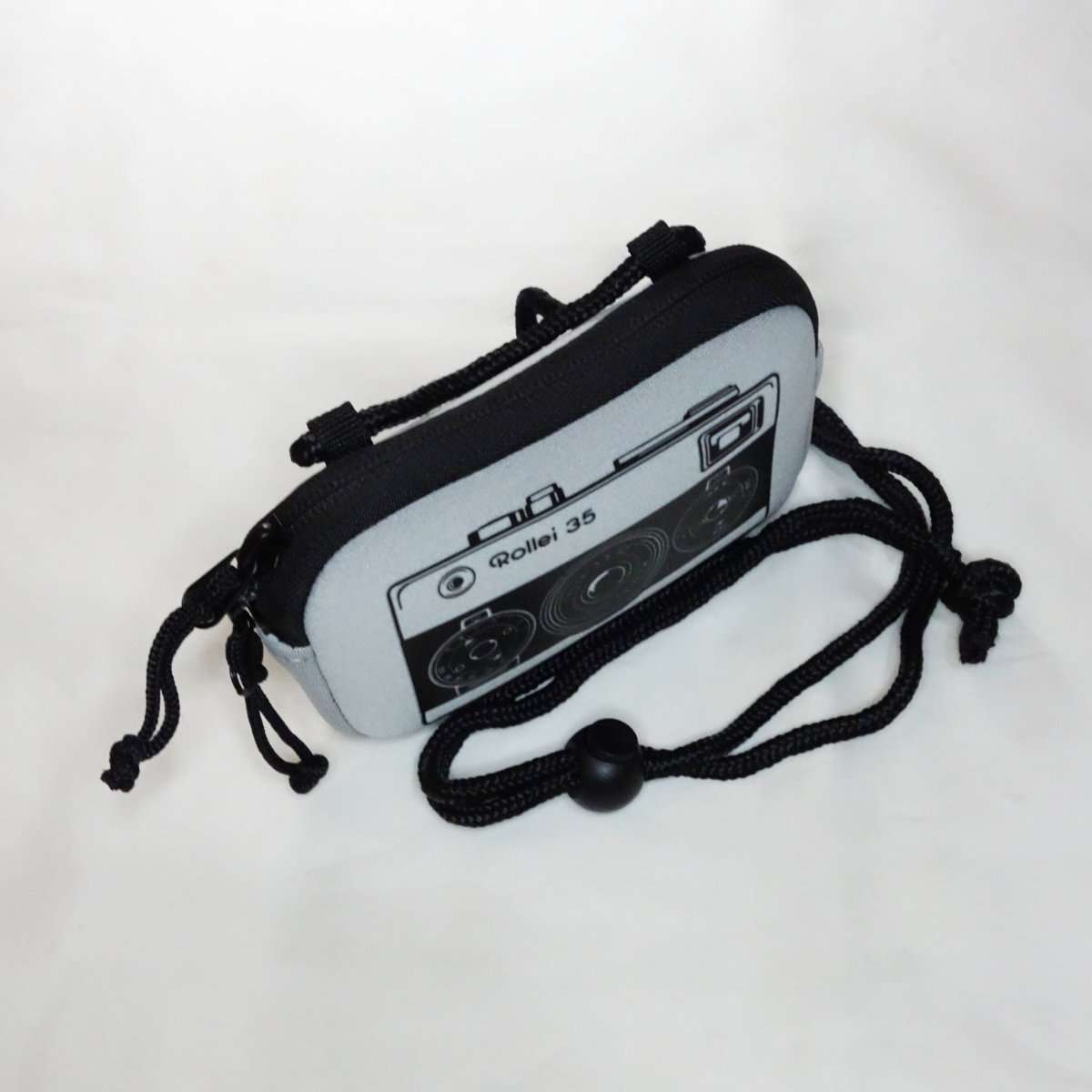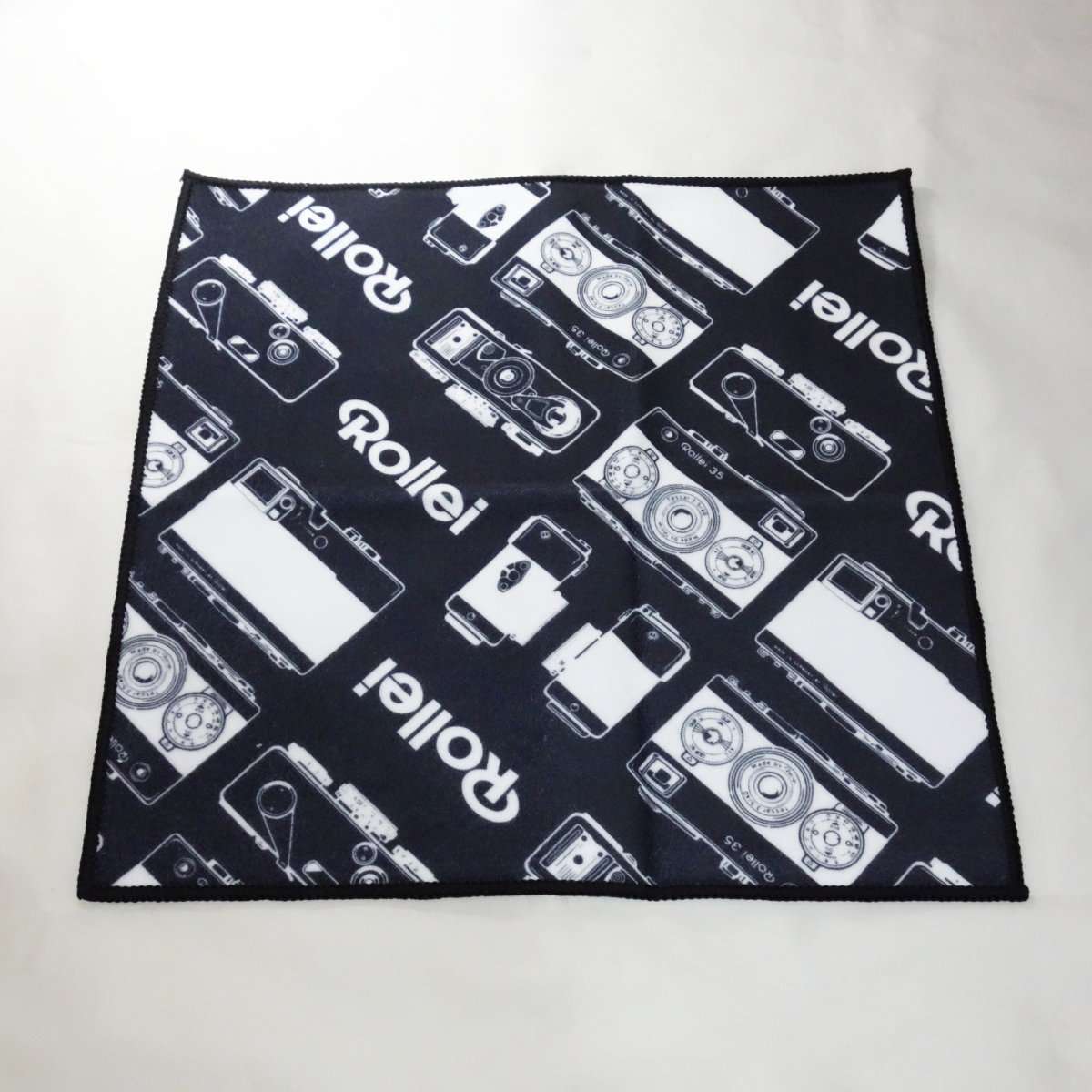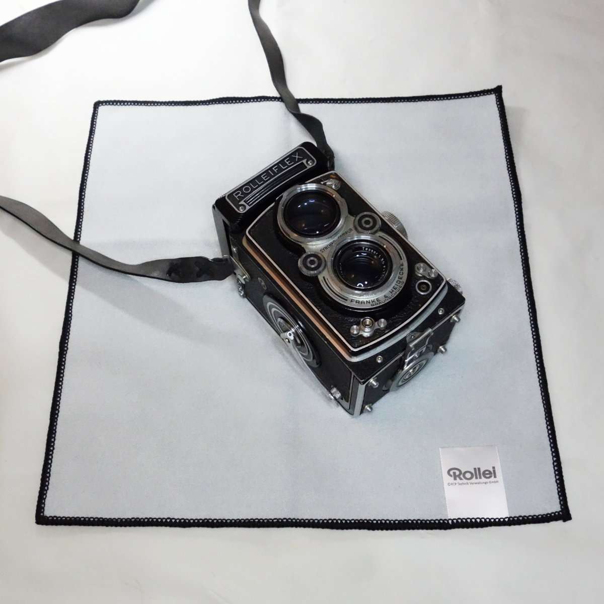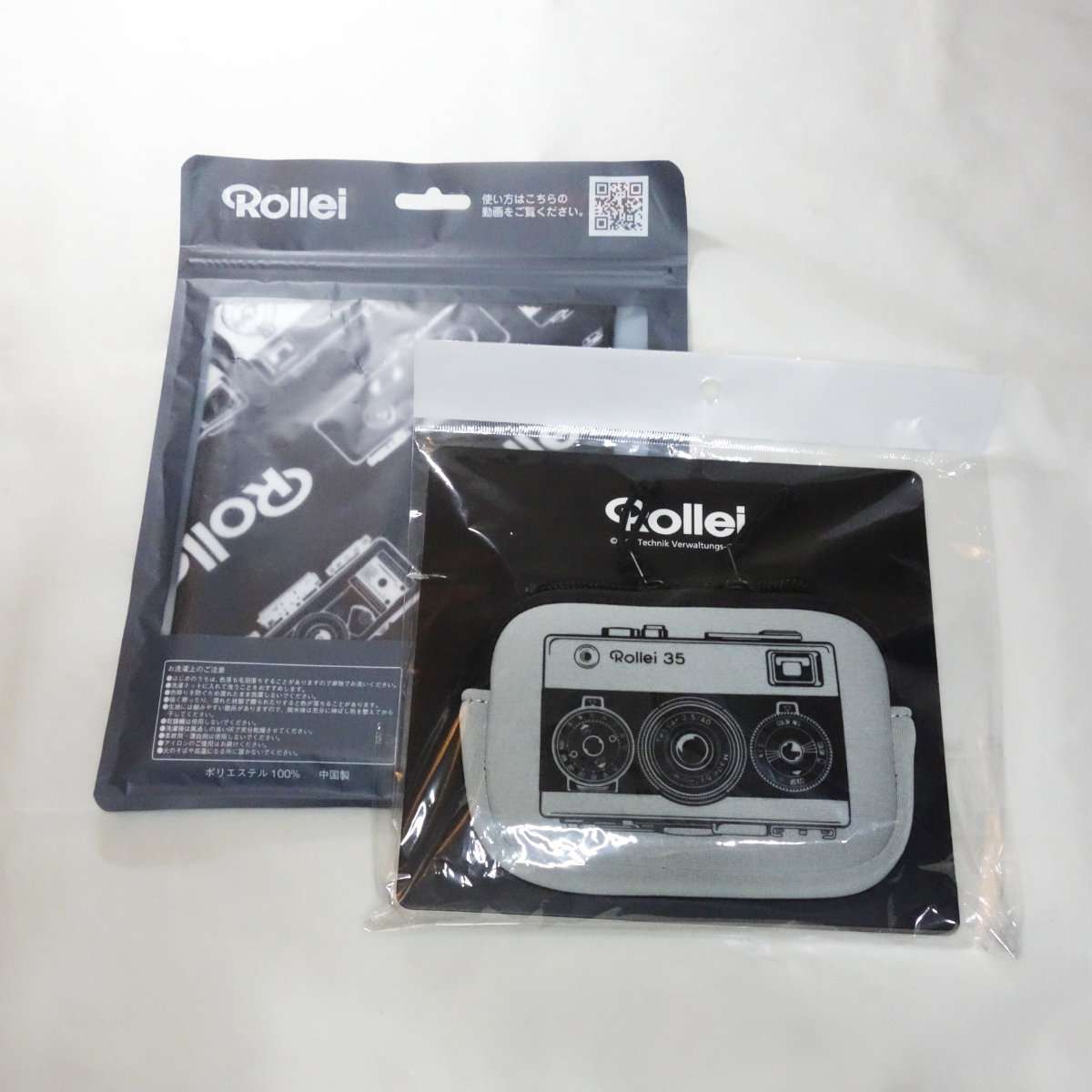 まず最初にローライ35がプリントされたコンパクトカメラ用ポーチのグレー(RL-015-LG)とカメララップのサイズ30cm x 30cm(RL-012M-BK)です。Rolleiflex柄のグッズもありますが、使用されたのが露出計内蔵のモデルでセレン部分がイラストになっていたためローライ35の方を選びました。ポーチは首からかけられるシンプルなもので、カメララップはピタット!くっつくカメラクロスの表記通りに紐やゴムがなくてもラップクロス同士がくっつく面白い作りです。