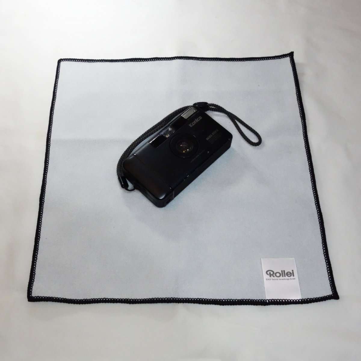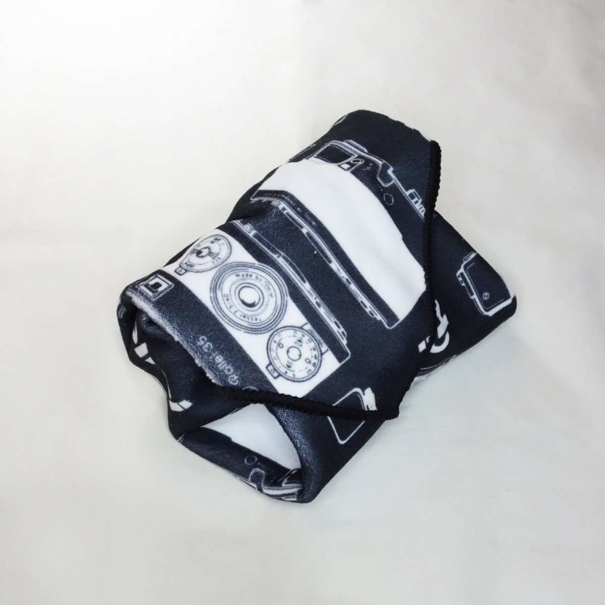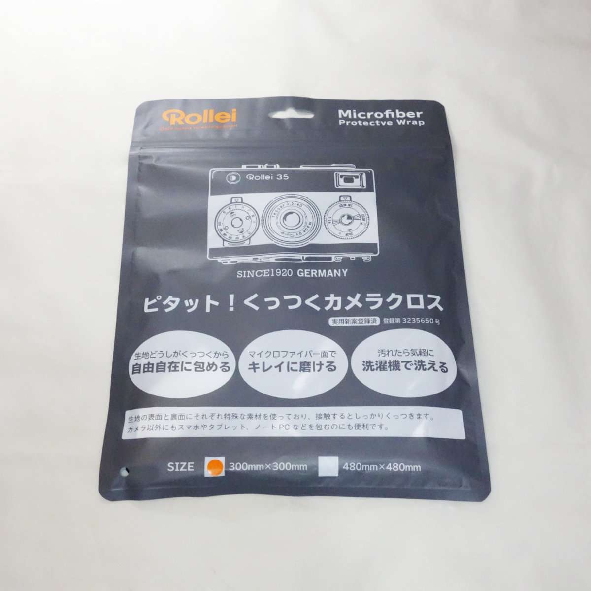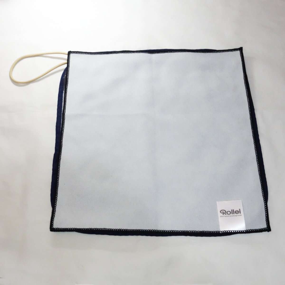 まず最初にローライ35がプリントされたコンパクトカメラ用ポーチのグレー(RL-015-LG)とカメララップのサイズ30cm x 30cm(RL-012M-BK)です。Rolleiflex柄のグッズもありますが、使用されたのが露出計内蔵のモデルでセレン部分がイラストになっていたためローライ35の方を選びました。ポーチは首からかけられるシンプルなもので、カメララップはピタット!くっつくカメラクロスの表記通りに紐やゴムがなくてもラップクロス同士がくっつく面白い作りです。