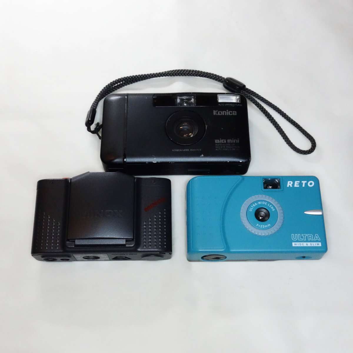 愛用しているコンパクトカメラの中から特にコンパクトなMINOX 35GT-Eと最近持ち歩いているRETO Ultra Wide & Slimと放置状態から復活させたKonica Big Miniにサイズが合うか試してみます。