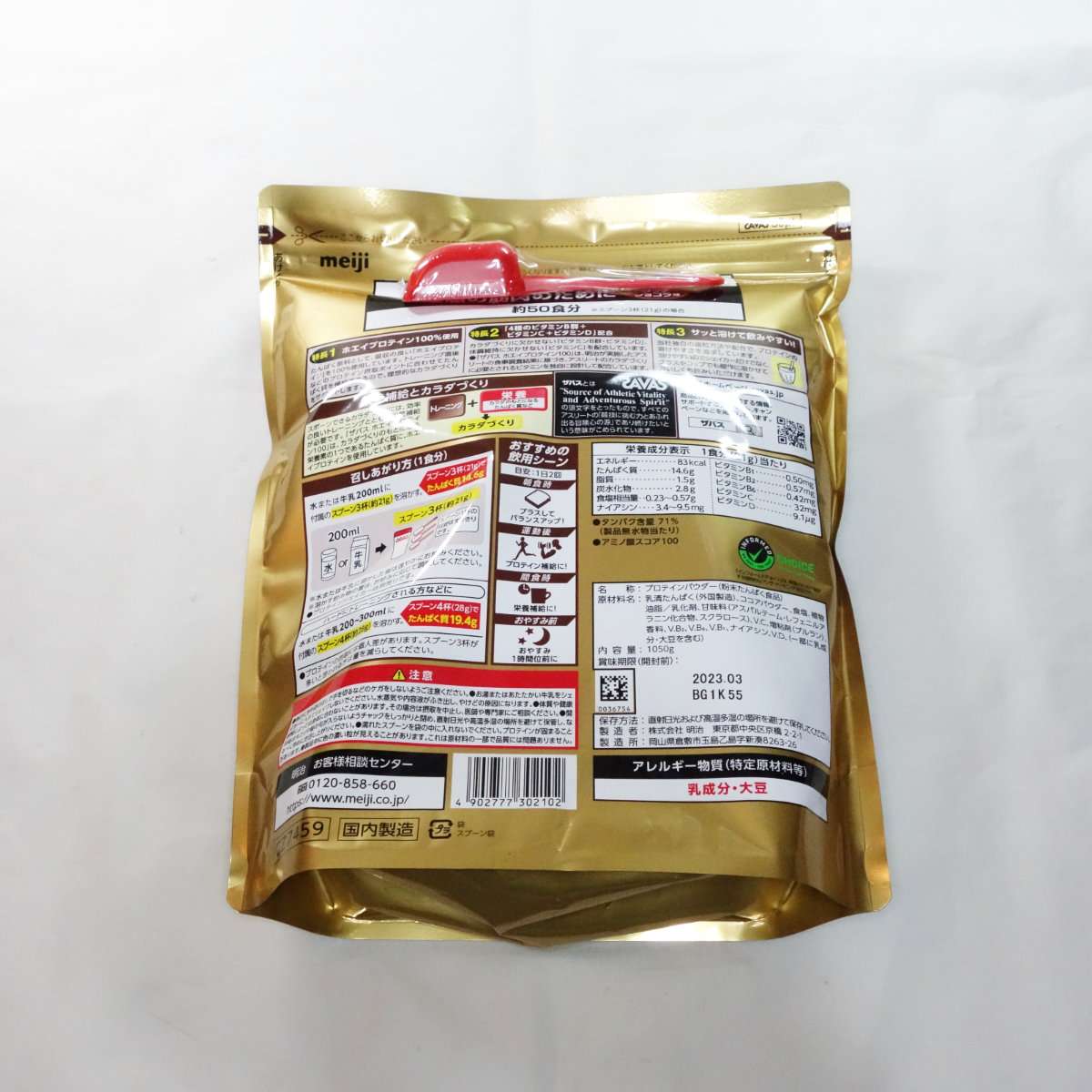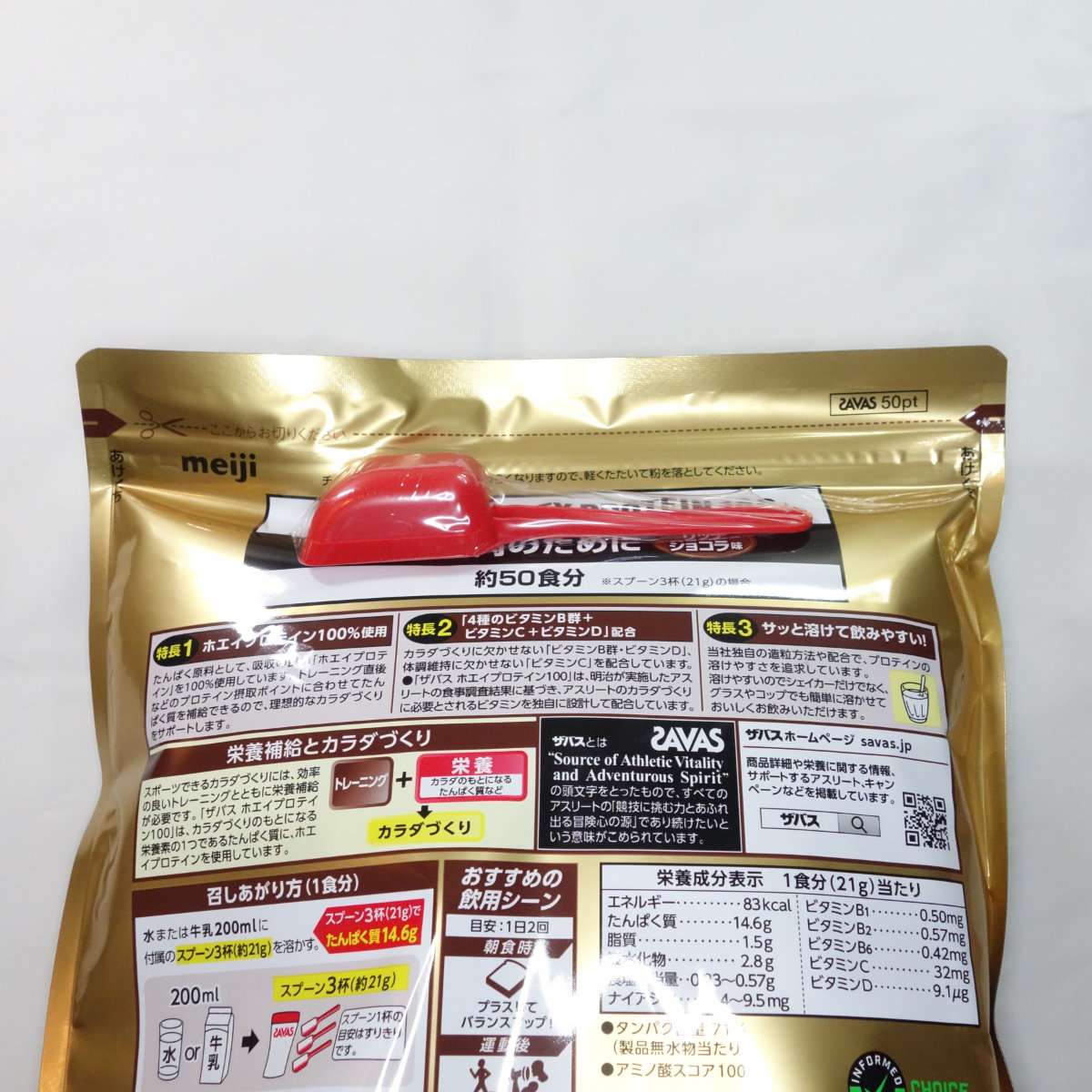 ザバスと言えば白い軽量スプーンでしたが赤のスプーンに変更されていました。ザバスのスプーンはプロテインの中に埋没しておらず外付けなのがよいです。