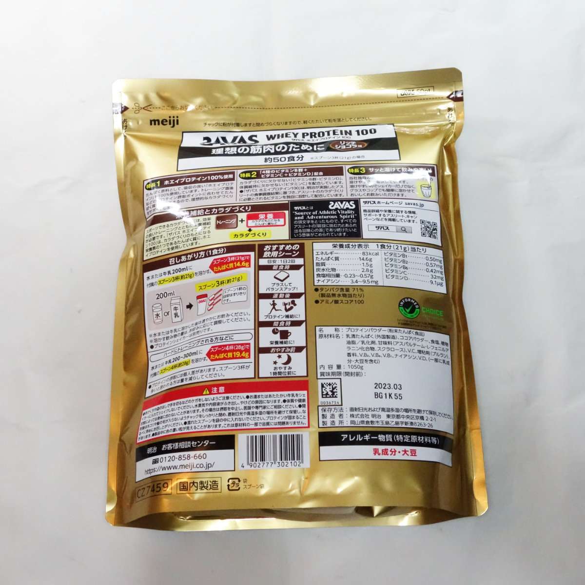 今回購入したのはザバスホエイプロテイン100のリッチショコラ味の1050gサイズです。同じザバスのココア味は以前から愛飲していましたが、今回新しい味を試してみる事にしました。味が合わないと飲み続けるのが難しくなるので、口に合うか心配な方は小さめのサイズや小分けのをまず試してみてから大きなサイズを購入するのもよいでしょう。