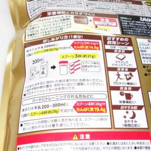 スプーンにプロテインをすり切り入れると10g前後になり21gだと2杯で十分ですが、説明には相変わらずスプーン3杯と書かれて、どうにかして多く消費させようとしてくるので注意が必要です。スプーン3杯で200mlの水か牛乳では溶けないと感じてる方はこれが理由ですので一度溶かす前にキッチンスケールで容量を測ってみましょう。