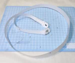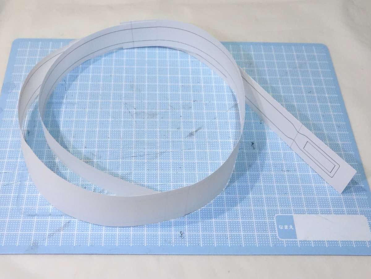 まずは変更した長さとストラップリングガードの形状などが適切かを型紙を切り抜いた状態で組み立てて確認します。プリントした型紙を実際に使用する形に組み立てます。この時に実際の金属のリングを使用してカメラに装着出来るようにします。この仮組みで使用した型紙は革の切り抜きには使用しないので、切り取り時に若干ズレても気にせずすすめましょう。基本的に長さとストラップリングガードの組み立てる向きなどさえ確認出来れば十分です。
