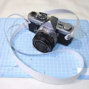 実際に使用するカメラに取り付けてみます。今回はストラップ自体が金属ボディのクラシックカメラ用なので、オリンパスの一眼レフカメラであるOM-2Nを使用しました。1970年代のカメラですが、設計から非常に洗練されていて当時では最小再形容となります。実際にカメラにストラップの仮組みを取り付けてみると幅広部分から長さまでちょうどよくこのまま作り出す事にしました。もちろんここで気になる部分などがあれば、この段階で型紙の修正をしましょう。
