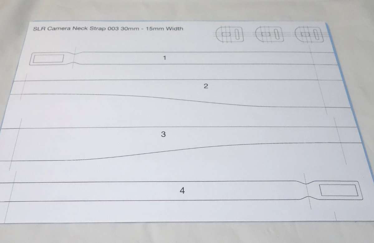 クラシック一眼レフカメラに似合うように作った斜めがけストラップがなかなかの出来だったので、大量に作れるようにしていく事にしました。しかも量産しつつ1本ずつ長さを希望に合わせて変更出来るようにして、オリジナルの1本でありながら作り方は簡略化する方向で進めていきます。実際に使用した型紙から完成までの流れを書いていきます。