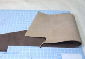 革を好きに変えられるのが自作のよいところですので、前回とは違う革を使用します。ブラウンで前回のグレーのストラップとはかなり色味が違います。切り抜いたあとがあるのはこの革でハンドストラップを作ったからです。
