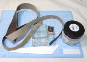 革の裏面(トコ)と断面(コバ)はそのままでは毛羽立ったままになるので、これを安定させるためにトコノールなどを使用して仕上げの処理をします。この工程ではトコノールを塗るためのヘラとトコノールを伸ばすためのガラス板やグラスを用意します。最近のおしゃれ系のストラップであるような切りっぱなしの革のままストラップを使用したい方はこの工程を飛ばして構いません。あと、トコノールなどの処理をすると色が濃い目になるので、その変化も含めて革を選んでおくとよいです。