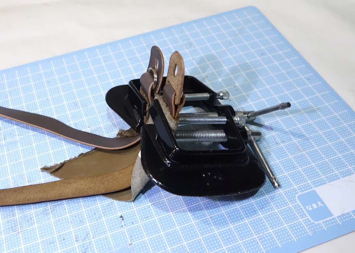折り返し部分を接着する時にリングとストラップリングガードを先に取り付けるので、この向きと入れる順番を間違えないのように一度仮組みをしてカメラに取り付けて確認しましょう。接着面がきちんと接着され縫いやすいように平坦になるよう、クランプをかけます。クランプは革の切れ端などをあて布として使用するとクランプの後がストラップにつきづらくなります。革の接着にはGクリヤーなど接着力が強すぎない接着剤がよいでしょう。