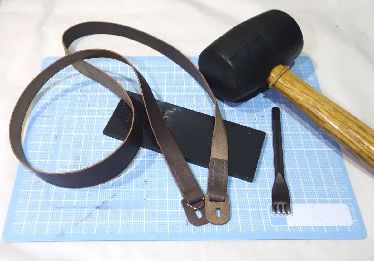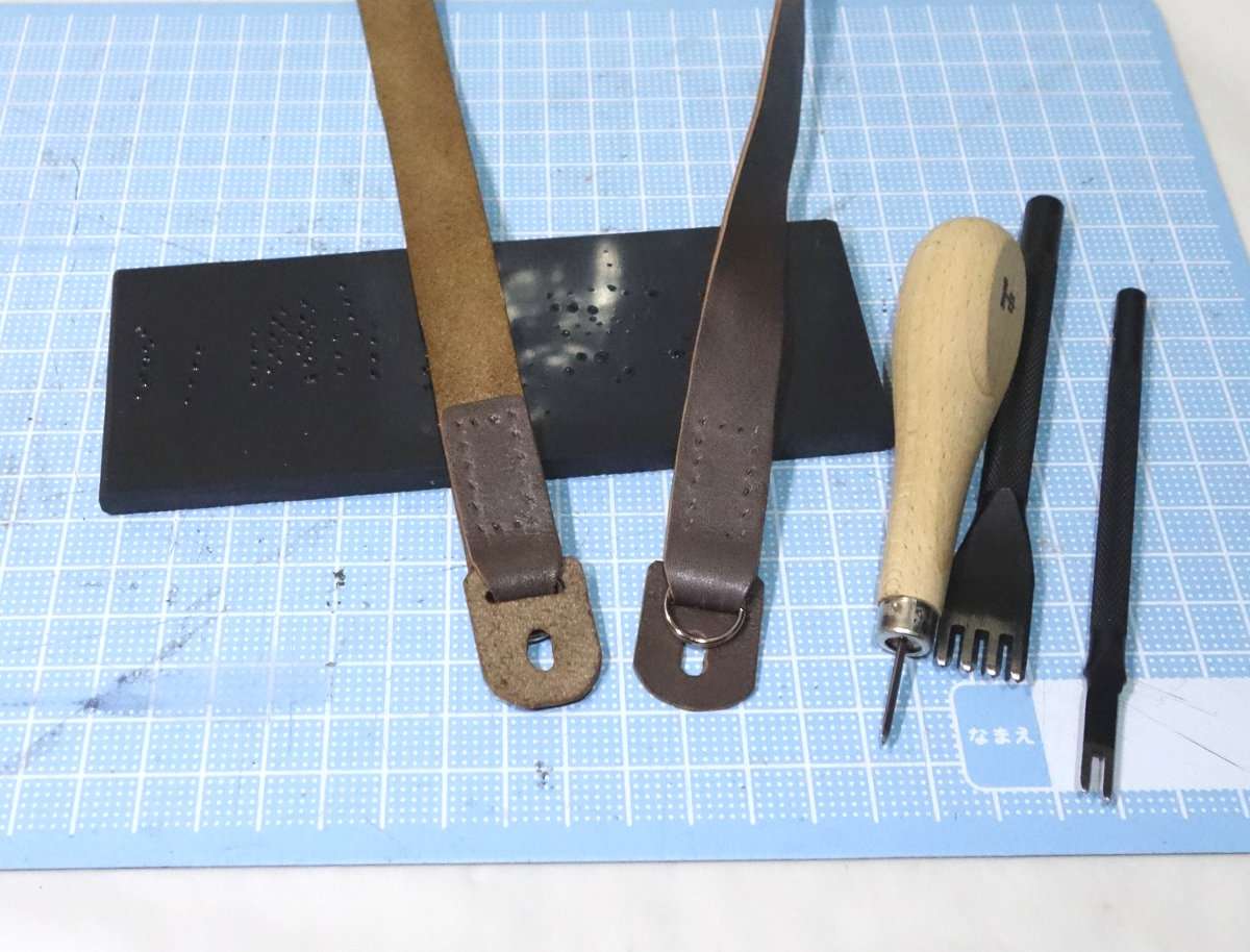 ストラップのパーツを入れて折り返し部分を接着したら、糸を縫うための穴をあけます。革に糸を縫うための穴をあけるためには、菱目打ちと言う道具を使います。プラスチック板の上に置いた革をこの菱目打ちをプラスチックハンマーなどで叩いて穴をあけます。この縫い目の穴を真っ直ぐあけるのは慣れが必要なので、革の切れ端などで練習しましょう。