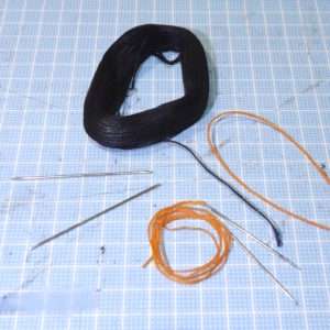 レザークラフトの糸は針を交互に通す事で縫っていきます。縫い目を揃えるために針を糸の上に毎回出して縫っていきます。このサイズのストラップにはこの太さの糸がちょうどよいようです。