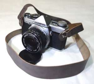 クラシック一眼レフカメラ用にデザインしたので、完成した斜めがけストラップをオリンパス OM-2Nに取り付けました。金属製のカメラでも問題ない幅で革の伸びもなく持ち重りがせず非常に使いやすいストラップです。ストラップリングガードが装着されているので、別のパーツを用意せずリングの傷がカメラのボディにつかないので安心して撮影が出来るストラップになりました。このストラップをもっと大きく重量のあるミノルタSR-T101やXEなどの金属製の一眼レフカメラに取り付けても全く問題なく使用出来ました。対応する重量的にもクラシックレンジファインダーカメラにも使ってもよいでしょう。