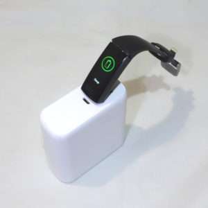 時計は動いていますが、まずはどれほど電池が持つのか調べるためにフル充電してから使用する事にします。充電は非常に簡単で先程つけたバンドの片方を外してスマホなどのUSB充電器に本体のUSB端子を差し込むだけです。