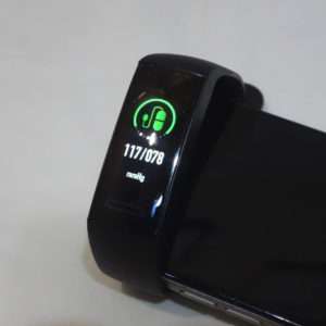 血圧測定の正確性を出すためにスマホアプリ側で普段の自分の血圧を設定します。その値(例えば120/80)から上下した分を測定値として表示しているようです。10分に一度測定するのでよく見るとグリーンのレーザーがよく照射されている事に気が付きます。