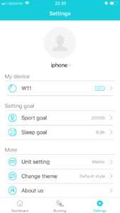 W11は非常に小型なので本体側ではデータの表示などしか行う事が出来ず、基本的な設定や変更などはアプリ側から行う事になります。デフォルトの時計のデザイン脈拍が速くなった時のアラームなど細かく設定が可能です。各SNSとの連携もこの設定から行う必要があり設定するとLine, Facebook, WhatsAppなどの通知をW11に表示する事が可能になります。W11からスマホ側の写真も遠隔で撮る事が出来たり、スマホから離れると振動して教えてくれたりと面白い機能もついています。