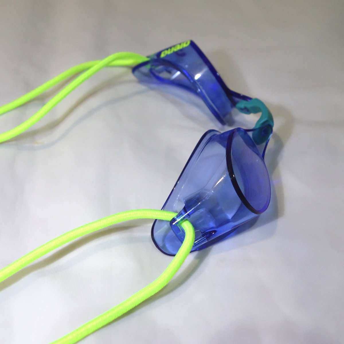 今回のストラップはブルーに合わせて派手な蛍光イエローにしました。今回はSoltec Swimのスウェディッシュゴーグルではなく、以前購入したアリーナのタフストリームゴーグルと組み合わせます。このゴーグルはプレミアムアンチフォグ加工がされていて、曇りどめ効果が長持ちするのでおすすめです。