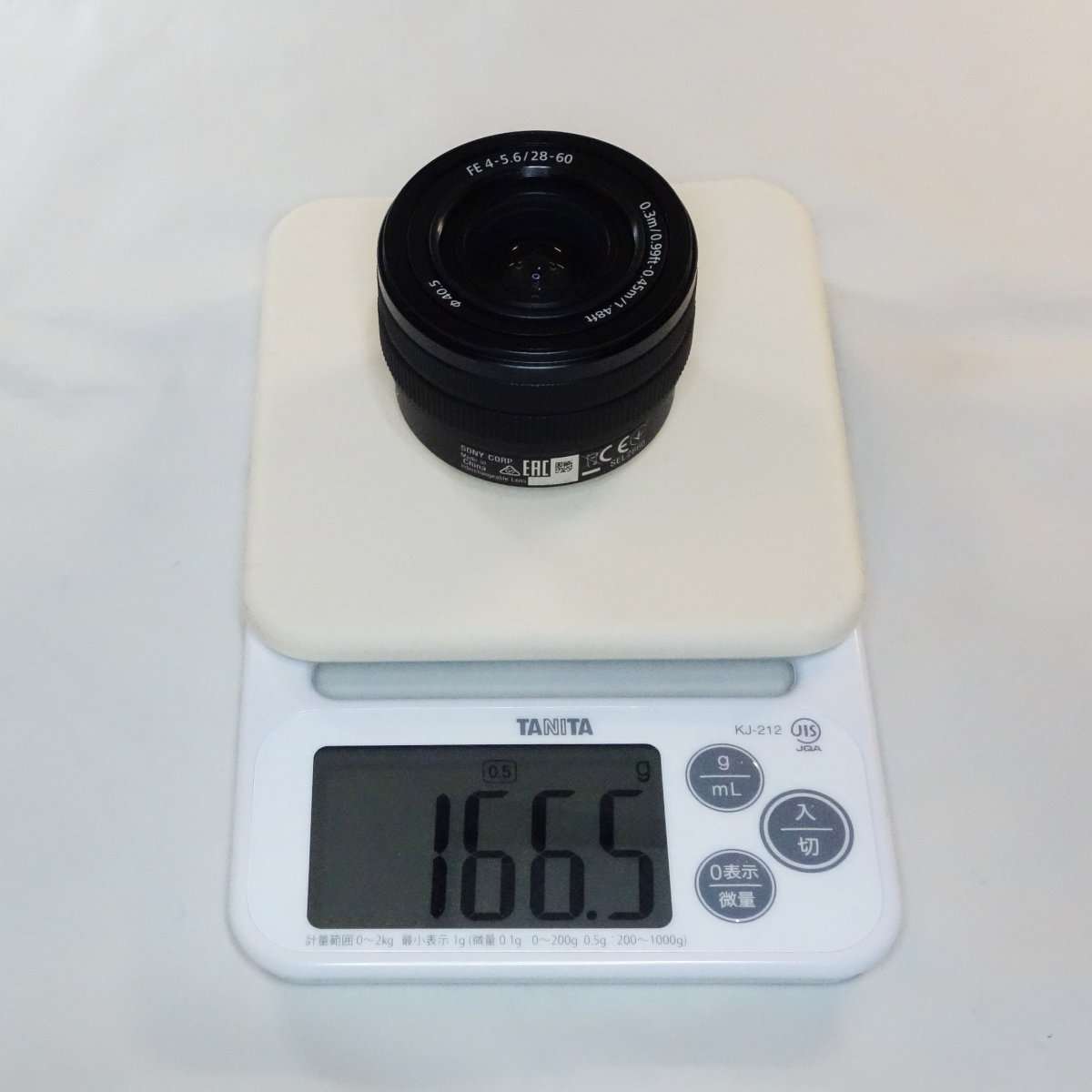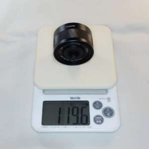 レンズ単体で計量すると119.6gと軽量なレンズなのがわかります。このレンズとSONY a7Cの組み合わせが最軽量ではなくソニー純正同士の組み合わせで最軽量と言うのは、他にAFや35mmも含めてもっと軽いレンズがあるからです。もう少しレンズの全長を短くしたサムヤンが同じ35mm F2.8のEマウント用AFレンズを出していてSEL35F28Zに比べても若干軽量です。あとはソニーから24mm F2.8, 40mm F2.5, 50mm F2.5のGレンズが発売されそちらもかなり軽量です。