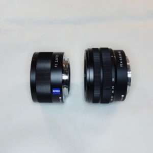 右のBatis 85mmと比べるとSEL35F28Zはかなりコンパクトです
