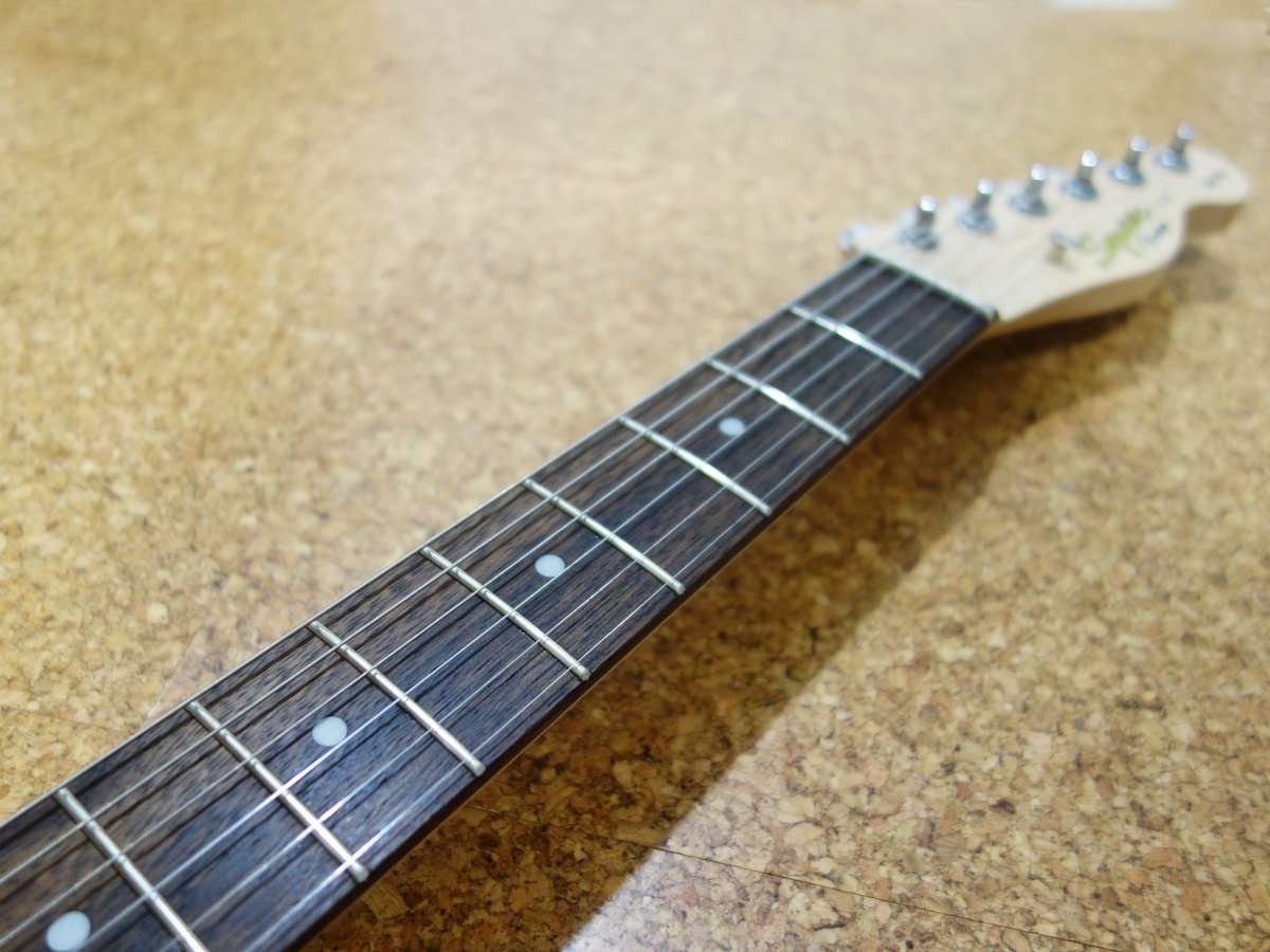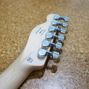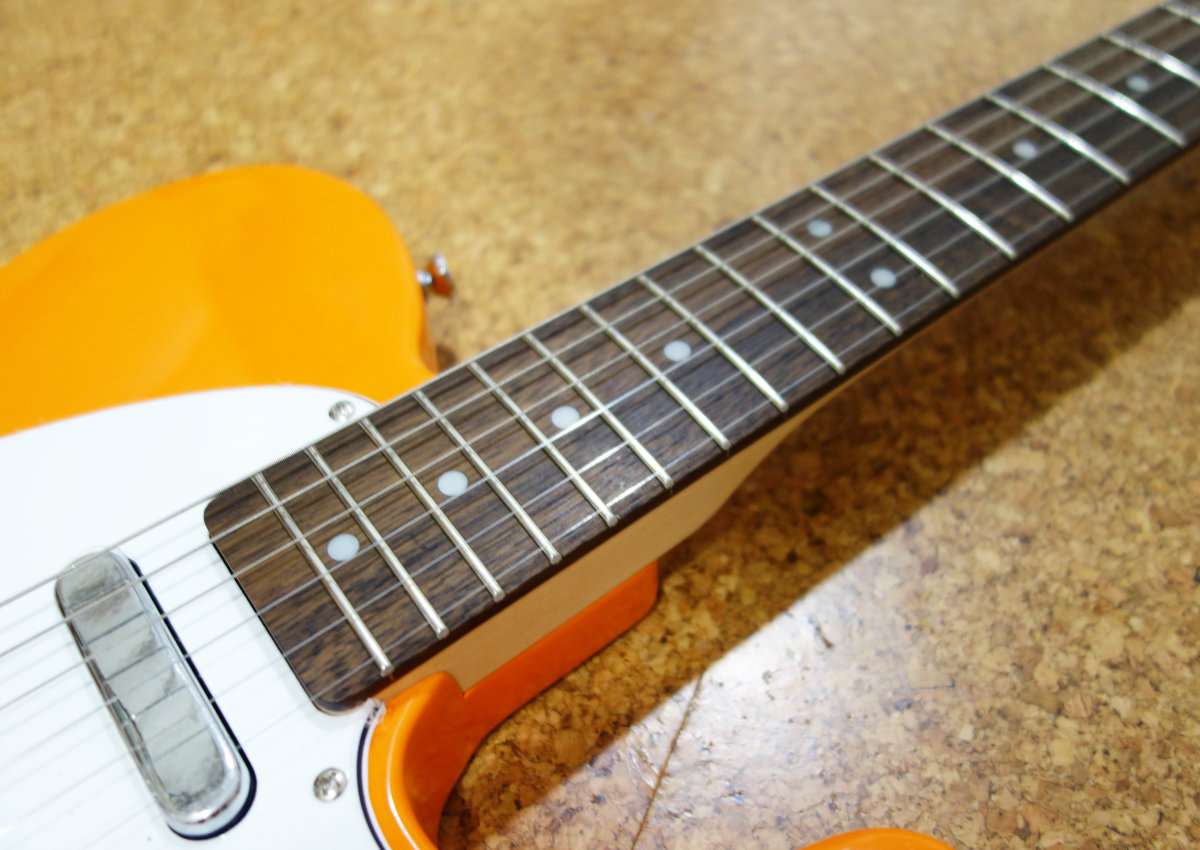 スクワイアのテレキャスターは実はボディがFenderのテレキャスターより薄くなっています。そしてそれに合わせてネックの幅も狭く厚みも薄くなっています。ネック裏はサテン仕上げでさらさらなので、非常に手を移動しやすく弾きやすくなっています。手の大きさとギターの上手さはあまり関係ありませんが、手の小さいお子さんや女性の方にも弾きやすいギターである事は間違いないです。