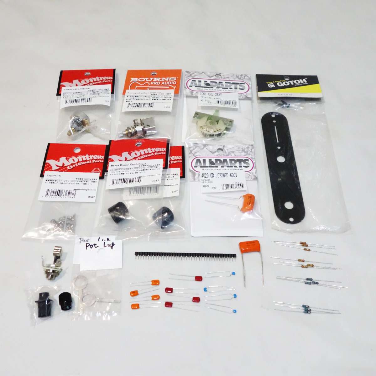 テレキャスターの回路を組むために必要なパーツを集めました。主なパーツはCTSポット、スイッチポット、CRL 3wayスイッチ、スイッチクラフトジャック、Gotohコントロールプレート、モントルーブラスノブ、オレンジドロップコンデンサーです。細かいパーツとしてはトレブルブリードを組むためのコンデンサーと抵抗、ポットラグ、コントロールスイッチのノブなどです。