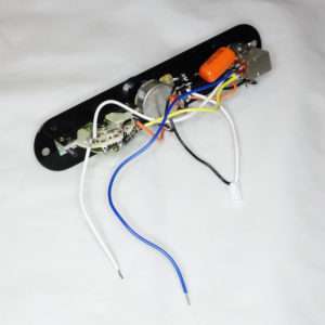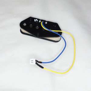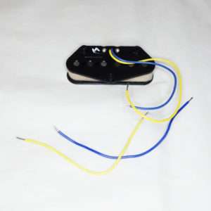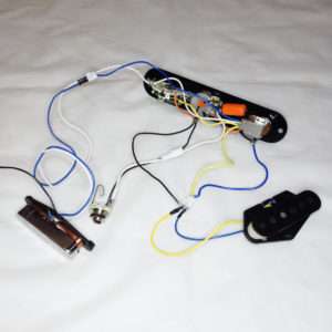プレートの上に半田付けした回路にピックアップを接続して通電の確認をします。アース線はギターのキャビティ内などに接続して準備は完了です。