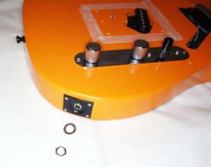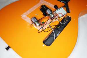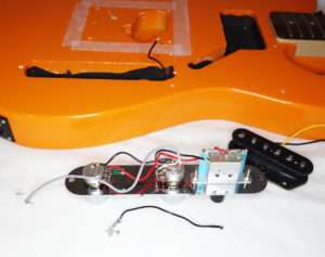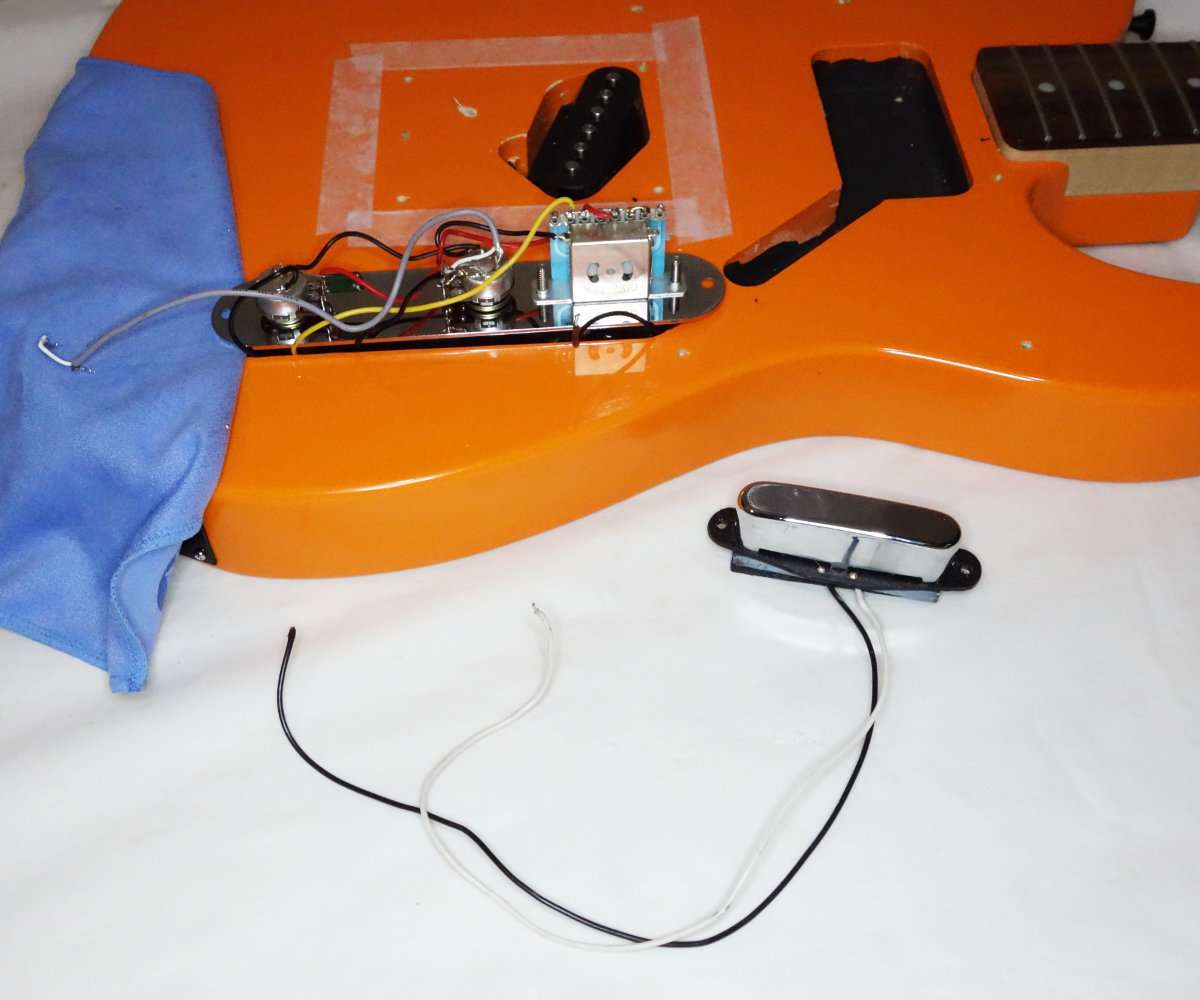 ピックアップの高さの最後の調整は弦を張った後にしますが、最初に組み込む際に大体の高さを合わせておいた方がよいので元の前後のピックアップの取り付け高さはボディから何ミリなどとメモしておきます。