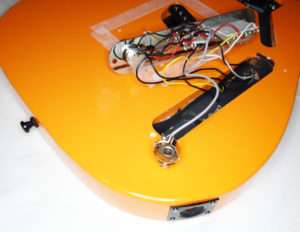 取り付けネジを緩めてピックガードを取り外します。フロントピックアップはピックアップではなくボディに直付けになっていて、導電塗料もかなり丁寧に塗られています。