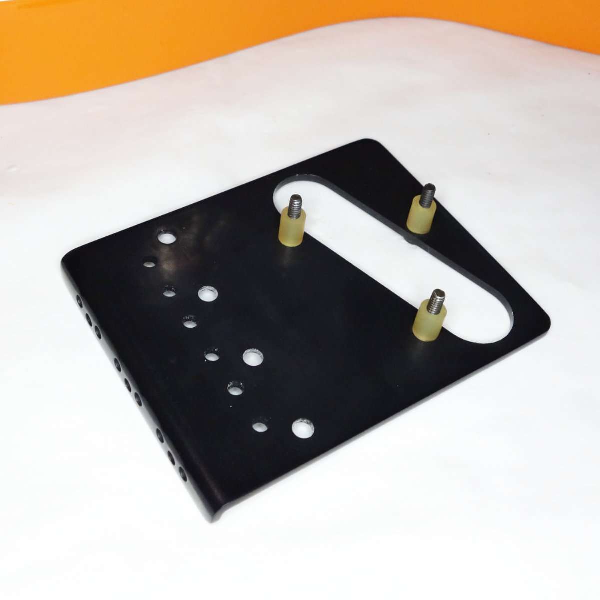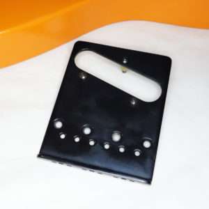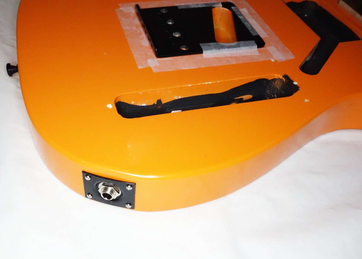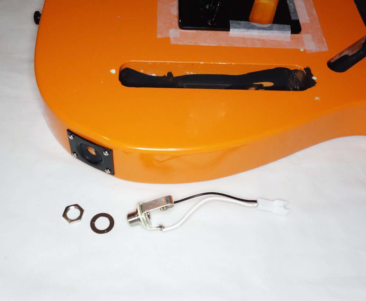 回路のプレートやピックアップを取り付ける前にまずシールド用のジャックを取り付けます。スクワイヤーテレキャスターのジャック取り付け位置は少し奥にオフセットされているのでボックスレンチなどで締める必要があります。取り付けづらいようであればジャック取り付けのプレートごとはずしてしまった方がよいでしょう。