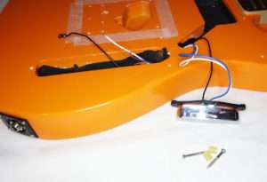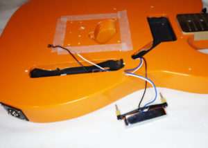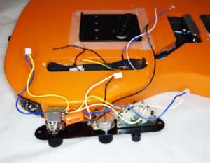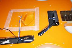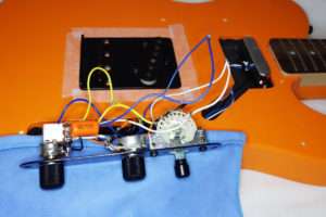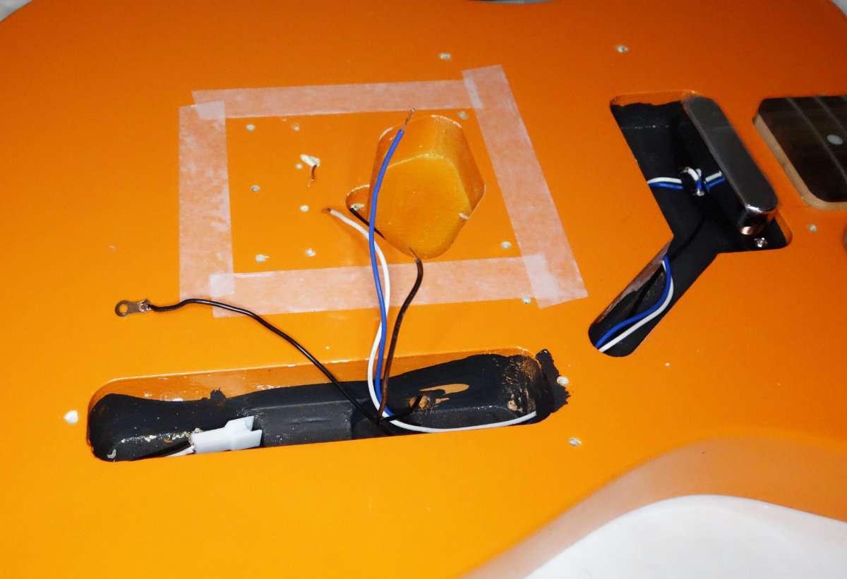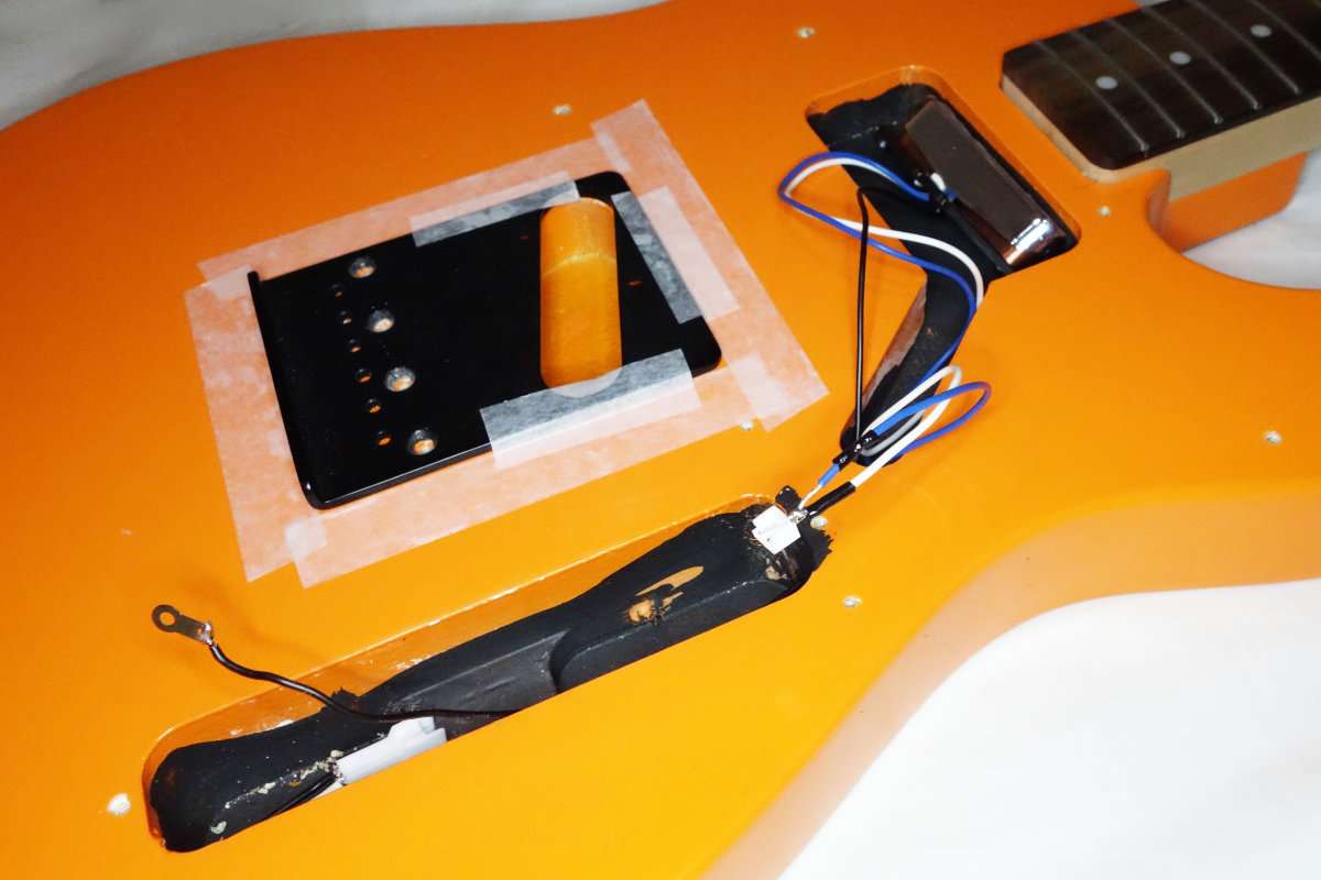 ピックアップからキャビティ内に引き込まれたケーブルとコントロールパネルの回路か出ている線を接続します。後ほどカプラーを取り付けますが線はからげて絶縁テープを張った状態で音出し確認をしてします。