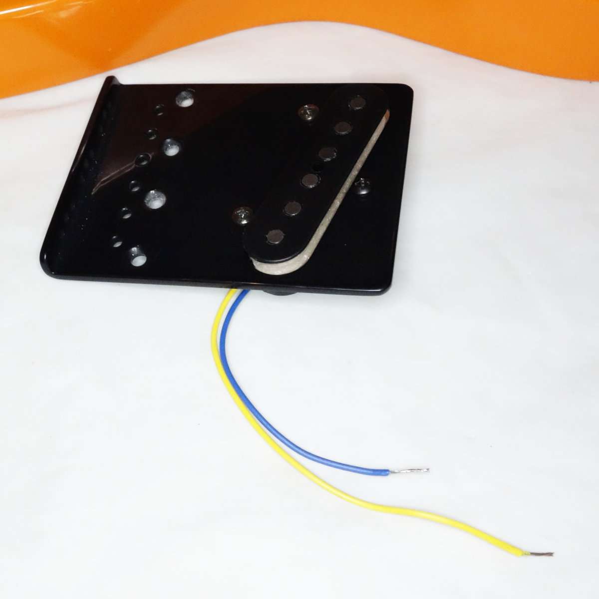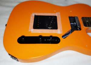 フロントピックアップの配線に取り付けたカプラーはキャビティの穴を通らなかったので(ギボシにすれば通るでしょう)いったん取り外して後ほど組み直します。ピックアップ取り付け用のネジとゴムのスペーサーを使用してピックアップをボディに直付けします。ピックアップの大体の高さは測っておいた通りに取り付けておけば最初の音出しで取り付け位置が大きくズレてしまうのを防げます。