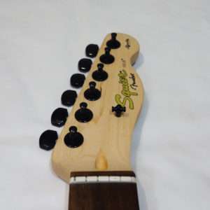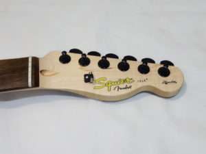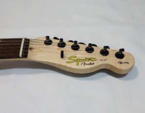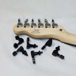 Squier Affinity Teleのチューナーは手に入れたブラックのものと全く同じ型で取付部に突起がありそのまま交換する事が出来ます。Fender PlayerシリーズやFender純正のロッキングチューナー(ロックペグ)は突起もあり形状は似ていますが、互換はないので無加工で交換をしたい場合は気をつけましょう。