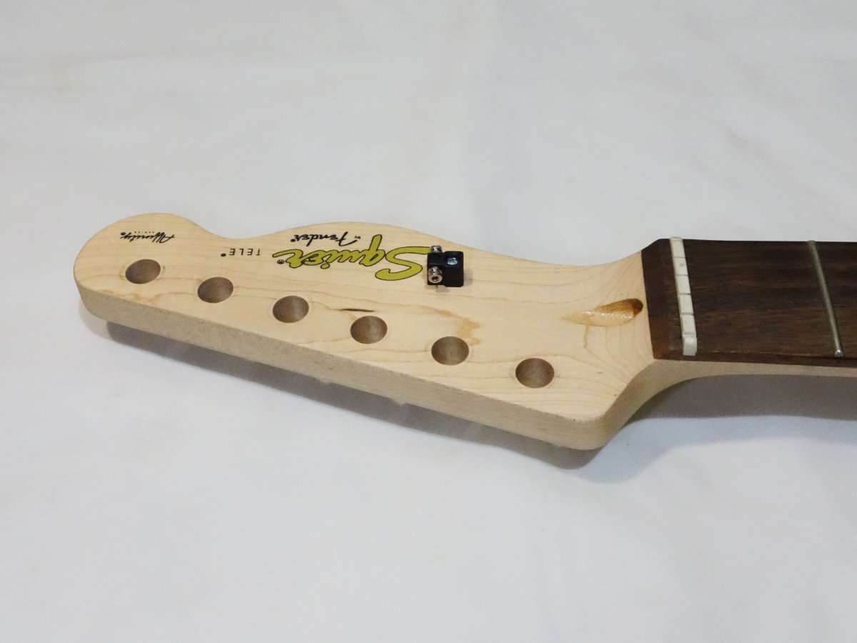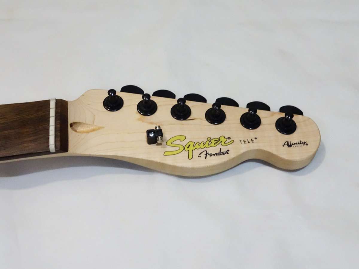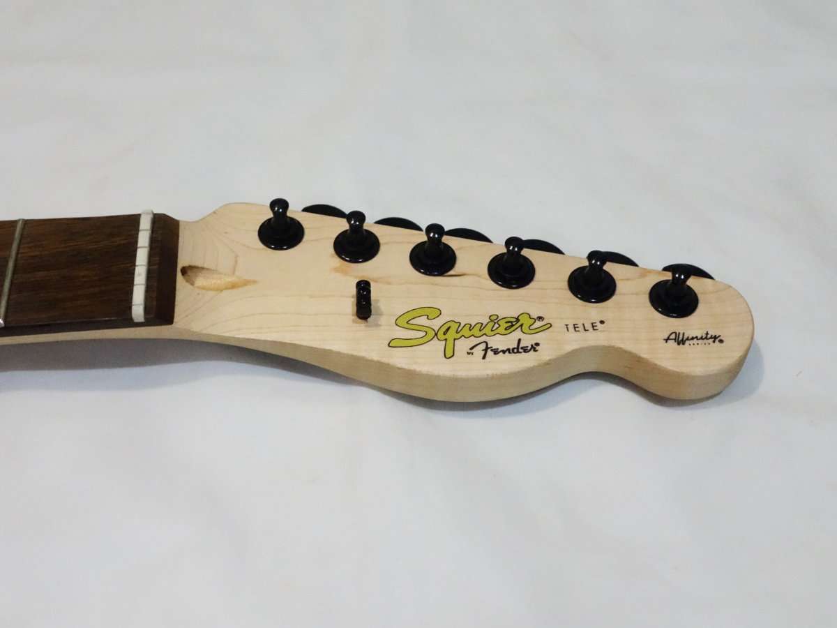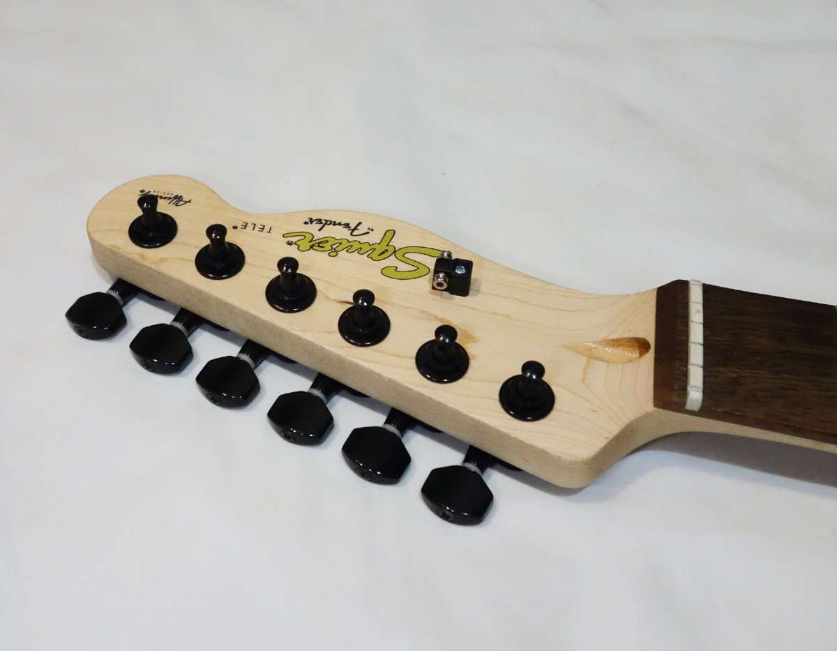 Squier Affinity Teleのチューナーは手に入れたブラックのものと全く同じ型で取付部に突起がありそのまま交換する事が出来ます。Fender PlayerシリーズやFender純正のロッキングチューナー(ロックペグ)は突起もあり形状は似ていますが、互換はないので無加工で交換をしたい場合は気をつけましょう。