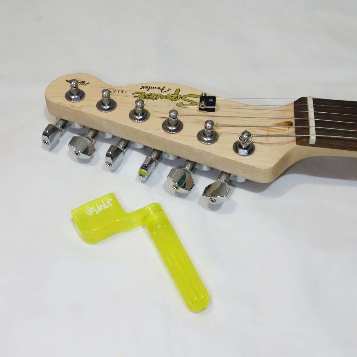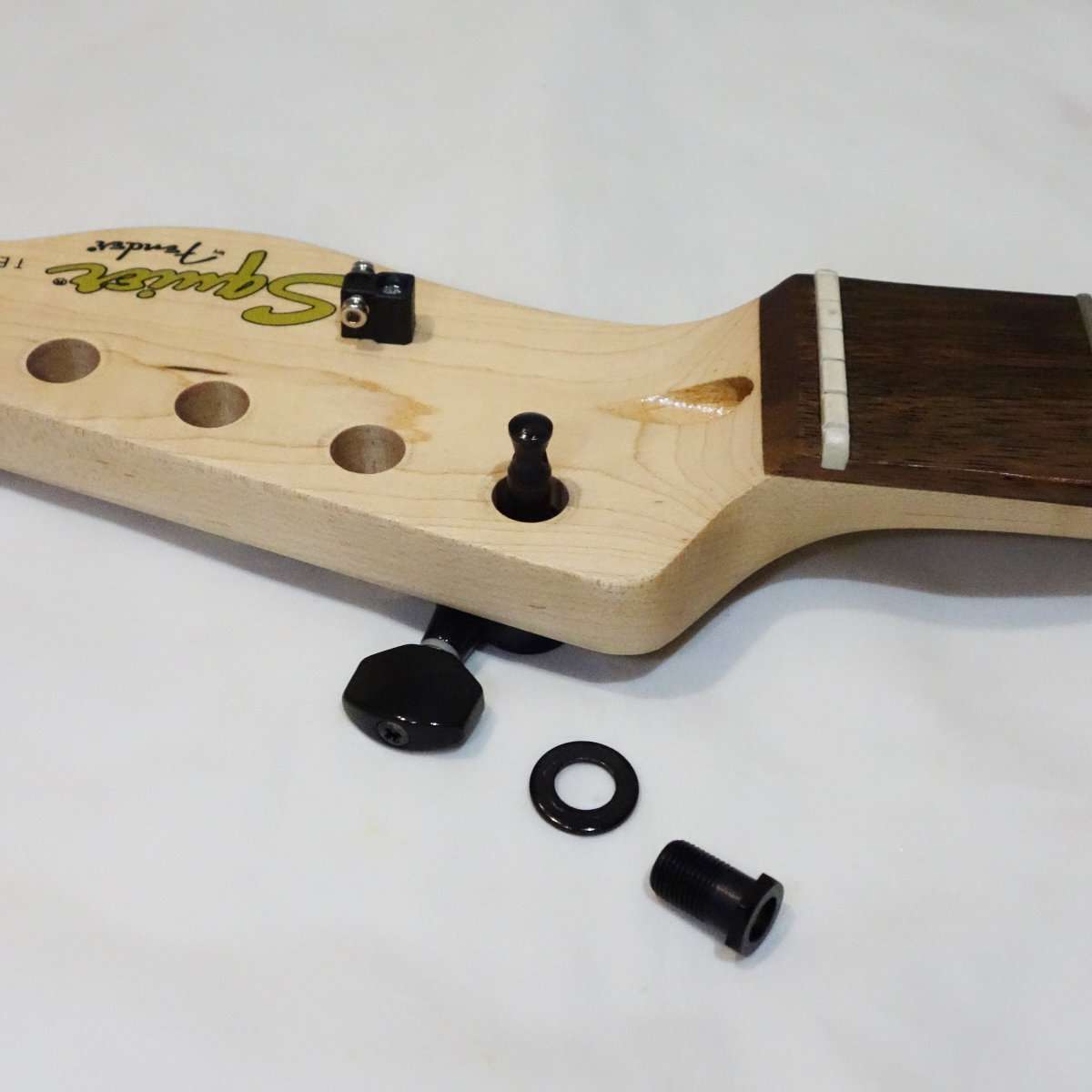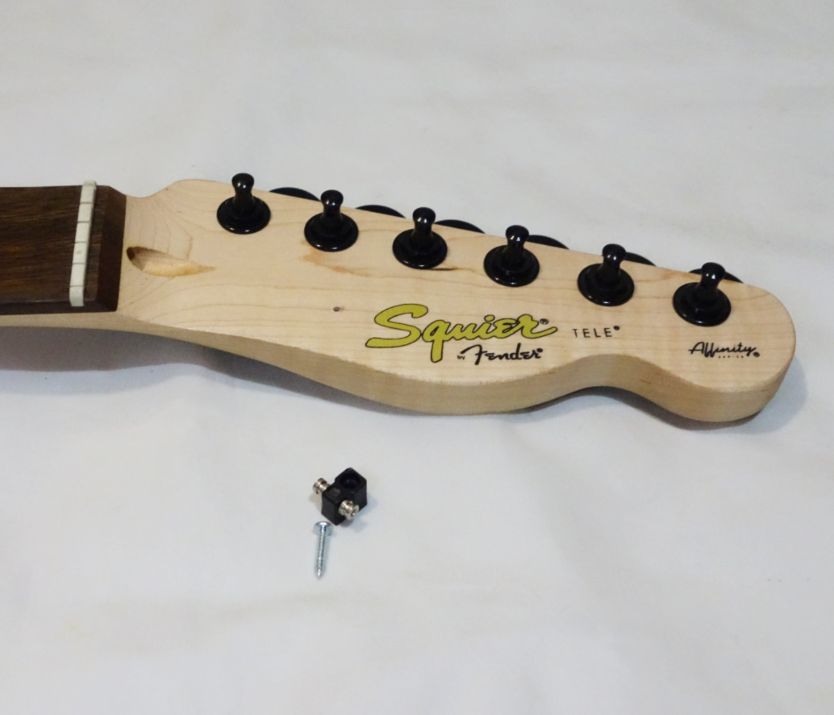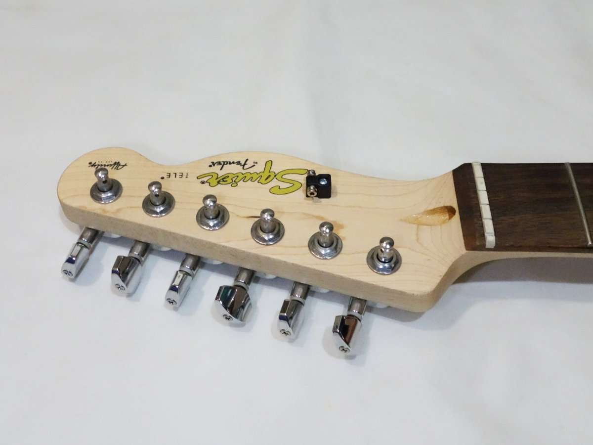 Squier Affinity Teleのチューナーは手に入れたブラックのものと全く同じ型で取付部に突起がありそのまま交換する事が出来ます。Fender PlayerシリーズやFender純正のロッキングチューナー(ロックペグ)は突起もあり形状は似ていますが、互換はないので無加工で交換をしたい場合は気をつけましょう。
