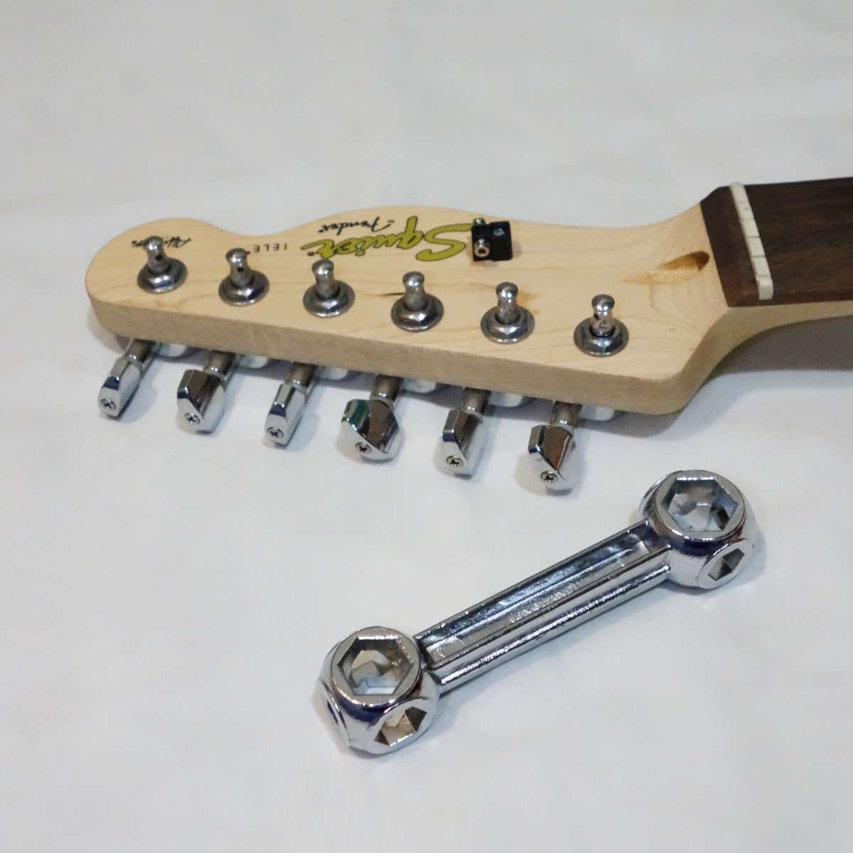 ペグ交換に必要な工具を揃えます。弦を交換する際にペグを交換してしまうのが一番よいですが、弦を再利用する場合はストリングワインダーがあった方が便利です。ペグそのものを取り外す歳は六角形のナットを取り外す必要があるので、ボックスやラチェットレンチ、もしくは六角レンチが必要になります。楽器用は特に車やバイク整備に使用するようなスナップオンやベータの最高のツールは必要ありません。