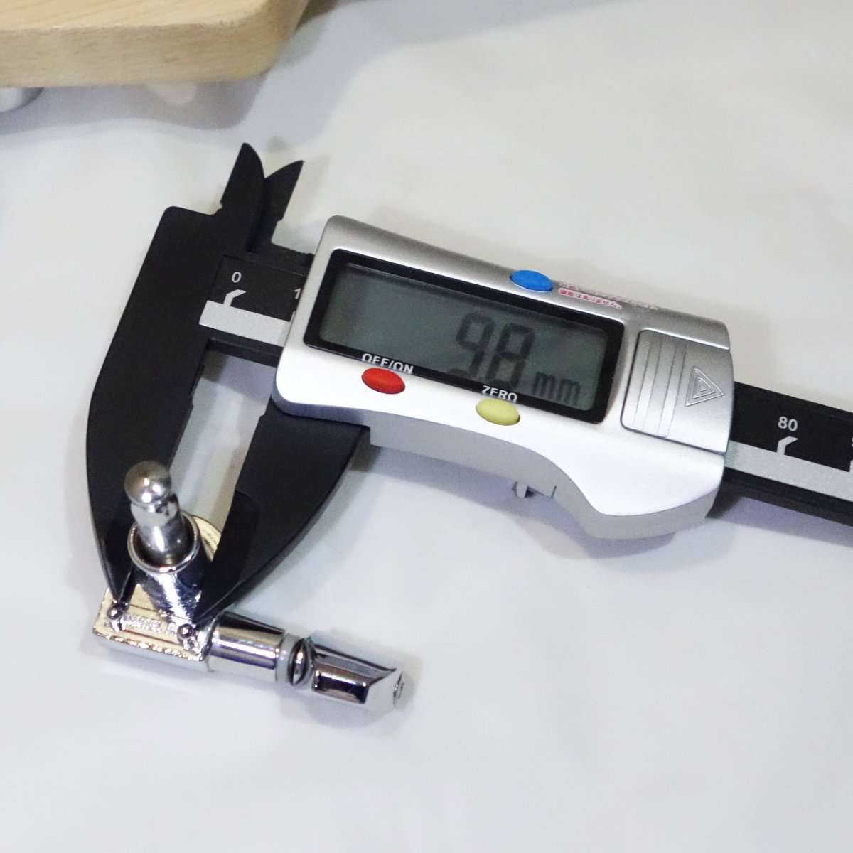 デジタルノギスで取り付け経を図ると9.8mmなので10mm穴用だとわかります。定規などでは直径は測りづらいですし、他の工作や改造などで役に立つのでノギスは安いのでもよいので1本は用意しておきましょう。