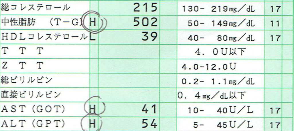 まずは18ヶ月前の中性脂肪の値ですが、それほど不摂生をしてなかったのにも関わらず502と過去最悪の結果をたたき出しました。AST(GOT)とALT(GPT)も若干高めでコレステロールは元々それほど高くないです。