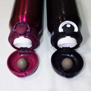 新型の大きな違いはキャップの開口部の角度が大きくなった事でしょう。旧型では飲む時に蓋のラバー部分(ブラウンのパーツ)が鼻先にあたり水滴が付いたりしていましたが、それが改良され飲み干す時に角度をつけても鼻にあたりづらくなりました。
