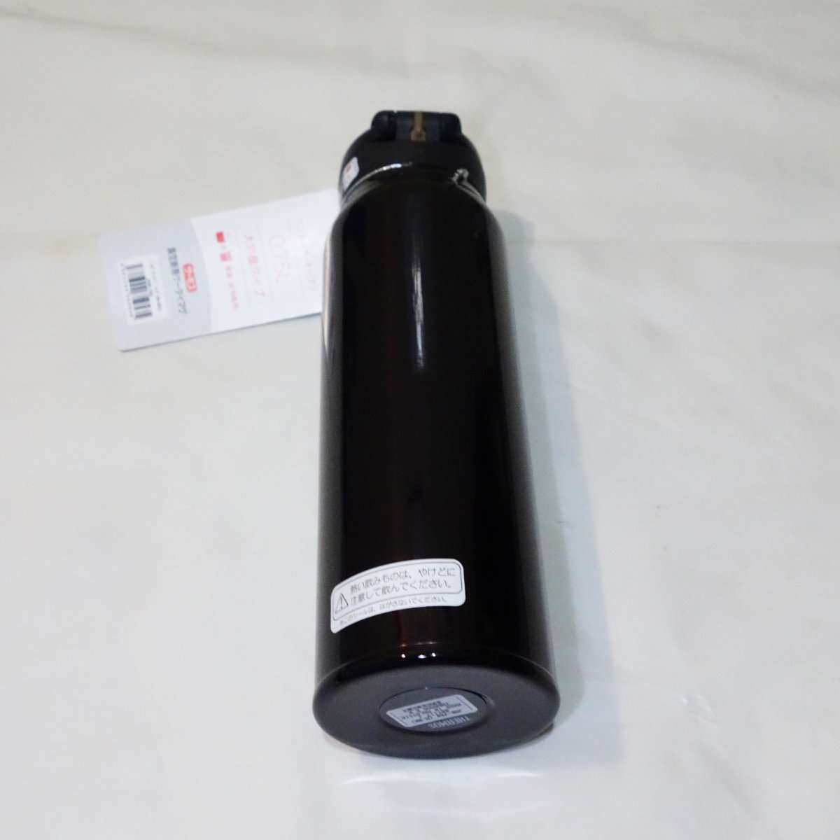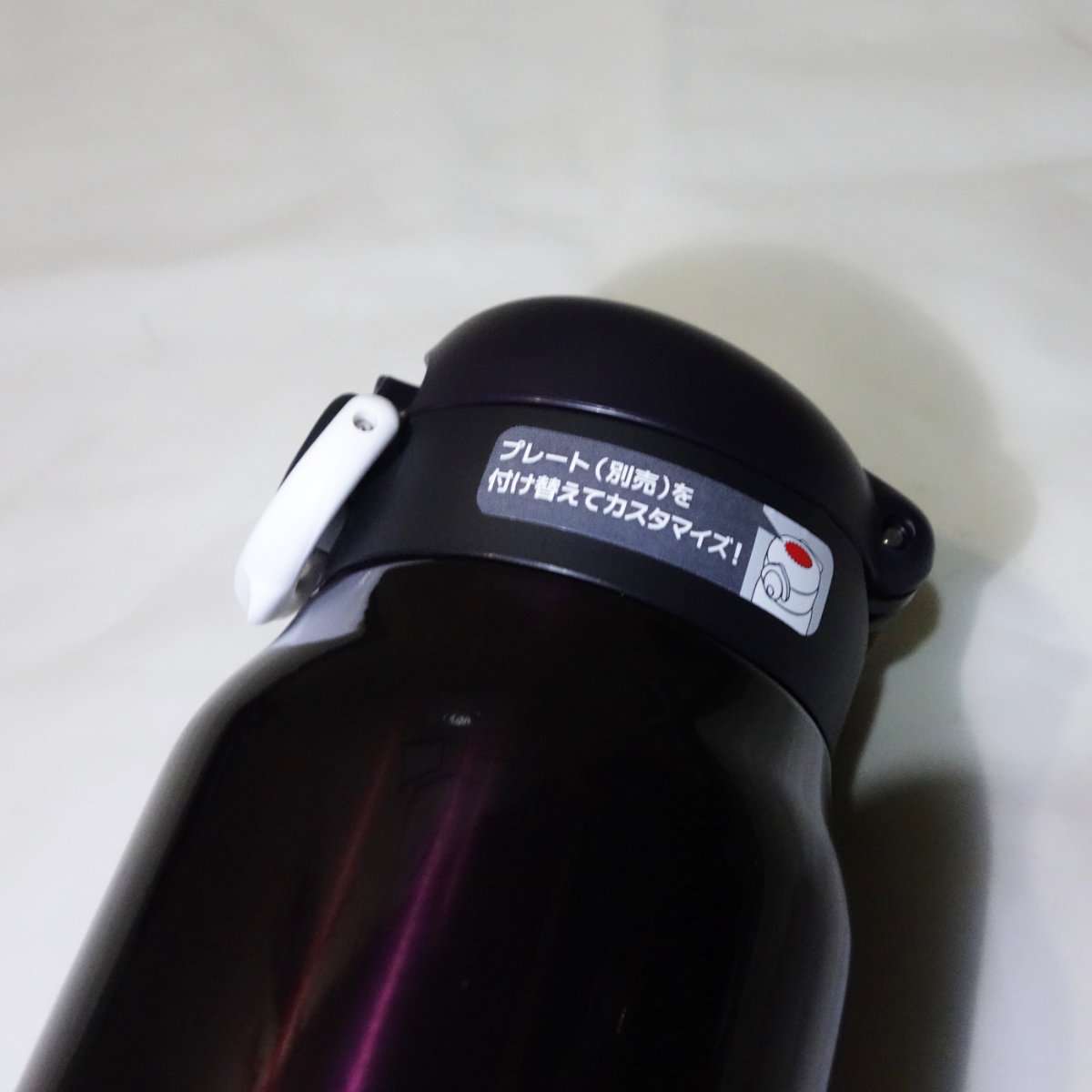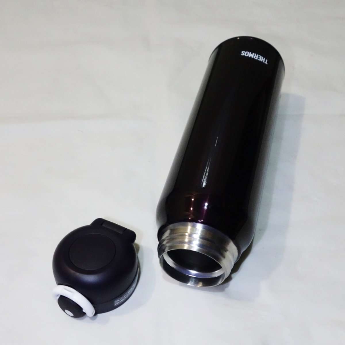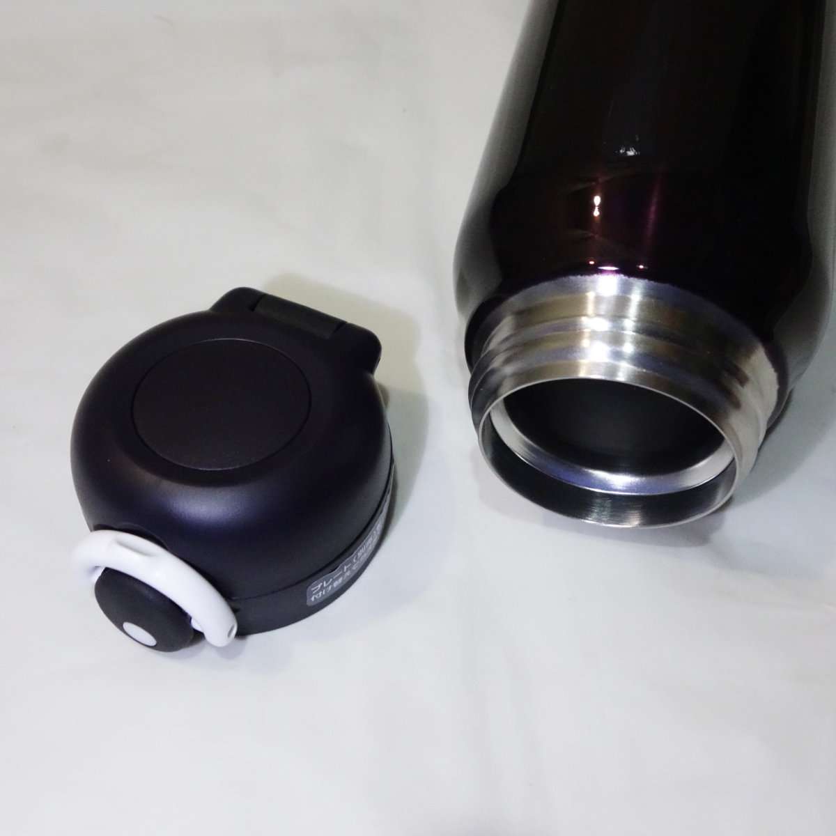 まずはミッドナイトブラックの方から開封しました。ブラックと言っても黒ではなく暗い紫系のカラーになります。サーモスと言えばキャップの直径のままスリムに長い商品が多かったですが、今回のは750mlと大容量だけにキャップより本体が太くなっています。