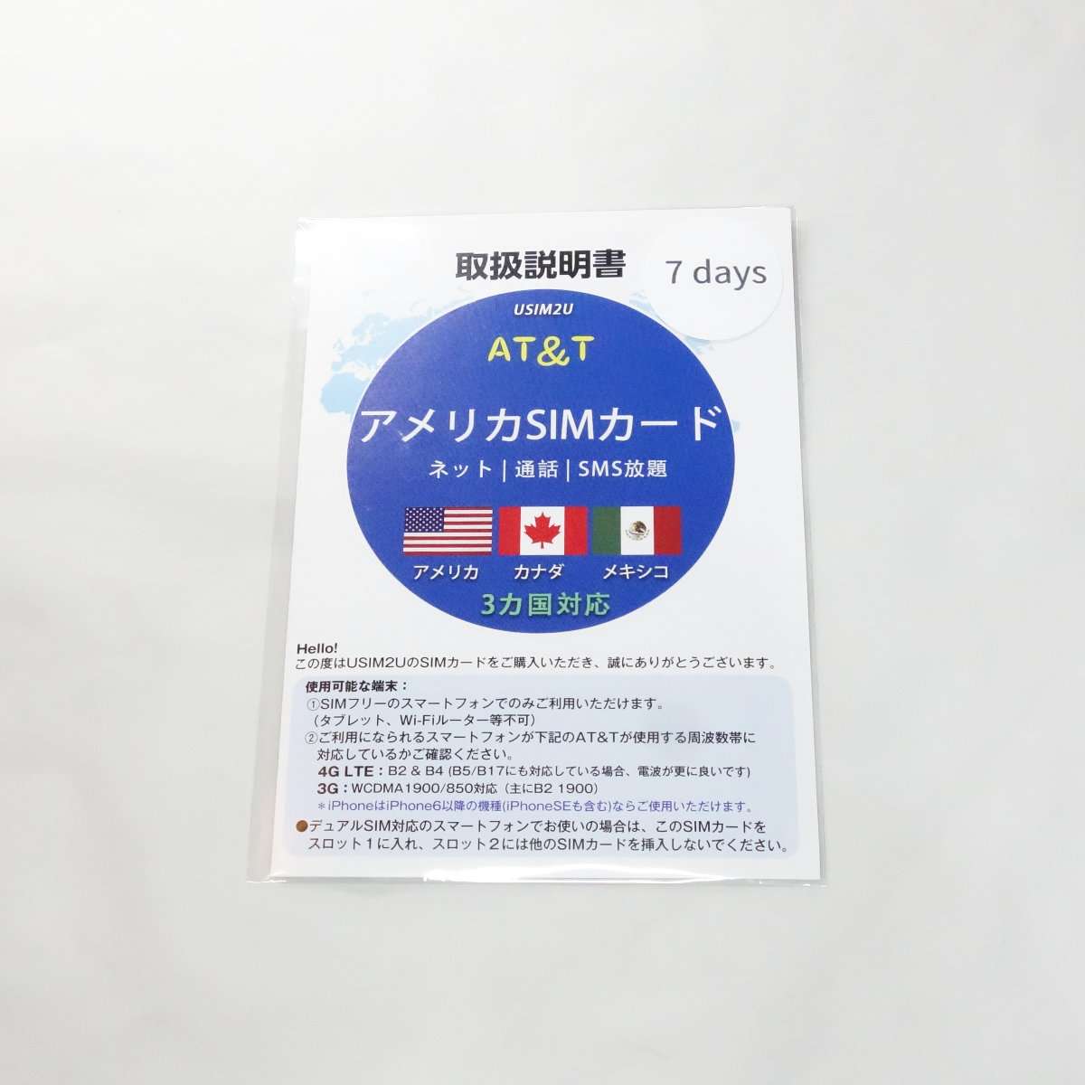 今回購入したのはAT&TアメリカSIMカードで、米国、カナダの北米とメキシコで使用可能になる事前決済のプリペイド式SIMカードになります。4G LTEと電話がかけ放題(現地から現地のみ)で7日間使用が可能なタイプです。AT&Tはアメリカの最大手通信会社なので安心です。ハワイはアメリカでも別のSIMカードが必要になる場合があるので、行き先がハワイの方はSIMカードのエリアがハワイ対応か確認してから購入しましょう。